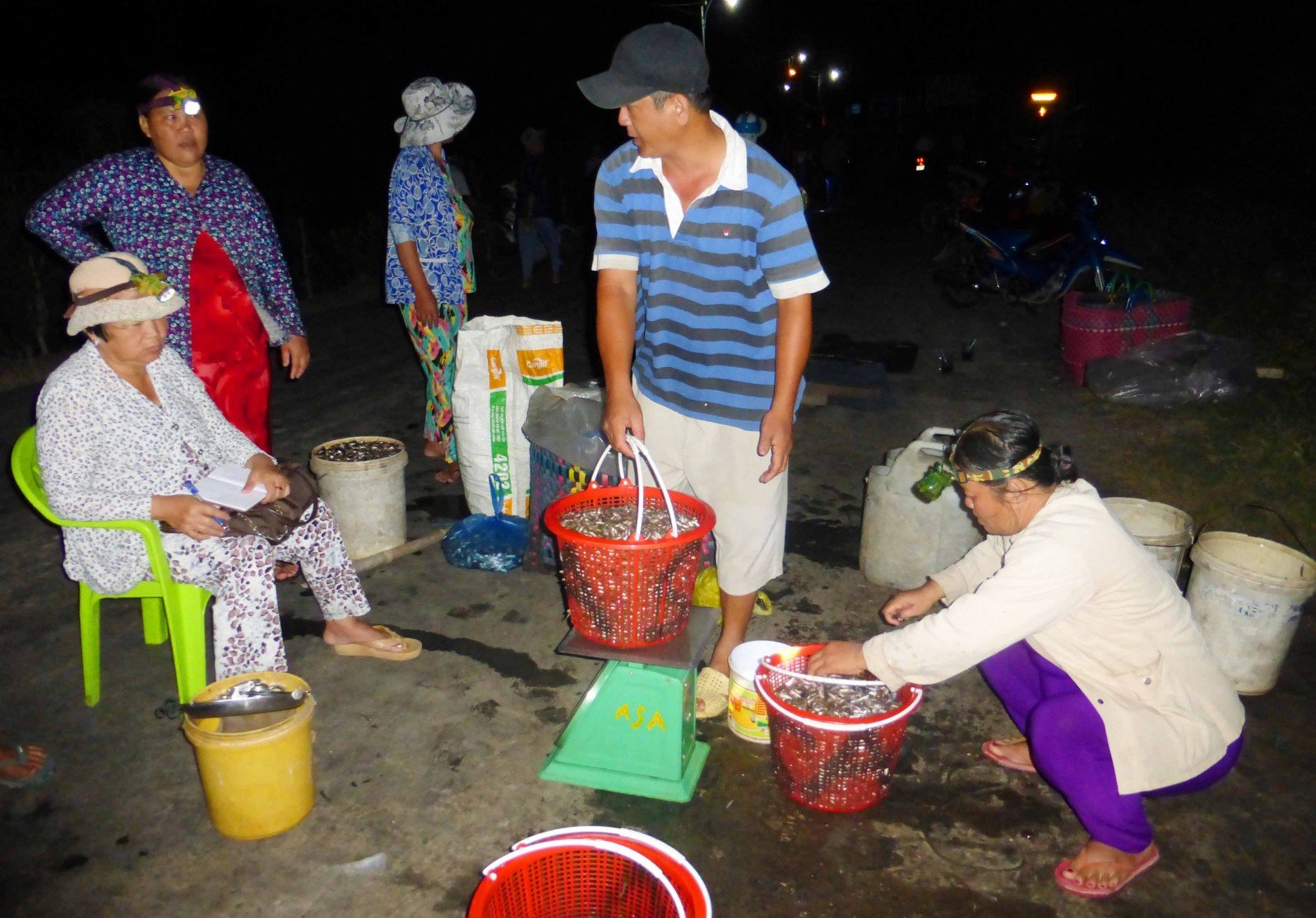 ຕອນກາງຄືນແມ່ນເຕັມໄປດ້ວຍກິດຈະກໍາການຄ້າປາທີ່ຄຶກຄື້ນ. ປາສົດ ແລະ ກຸ້ງຖືກແຈກຢາຍຢູ່ທົ່ວທຸກແຫ່ງຂອງພໍ່ຄ້າ.