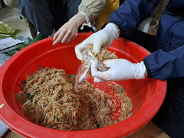 ຕໍ່ໄປ, ຄົນເຮົາໄດ້ປັ້ນມ້ວນປີ້ງໃຫ້ເປັນບານຂະໜາດທີ່ເໝາະສົມ ແລະ ຫໍ່ມັນໃສ່ໃນໃບກ້ວຍ, ດ້ວຍຖົງຢາງໃສ່ພາຍໃນ ເພື່ອໃຫ້ເຂົ້າໜົມປັງສາມາດໝັກໄດ້ຕາມທຳມະຊາດ. ການຫໍ່ມ້ວນພາກຮຽນ spring ຍັງຕ້ອງການຄວາມລະມັດລະວັງແລະການດູແລເພື່ອຮັບປະກັນມ້ວນມ້ວນແມ່ນແຫນ້ນແຫນ້ນ.