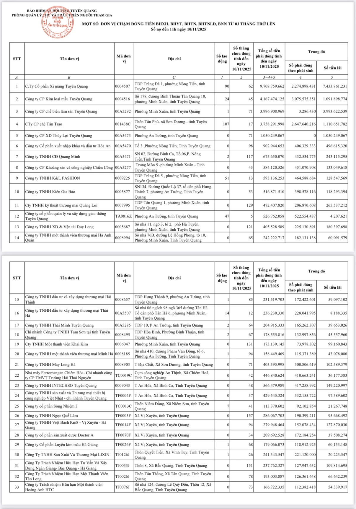 ທີ່ມາ: https://baotuyenquang.com.vn/thong-tin-quang-cao/202511/danh-sach-don-vi-cham-dong-bao-hiem-xa-hoi-bao-hiem-y-te-bao-hiem-that-nghiep-e9f0470/