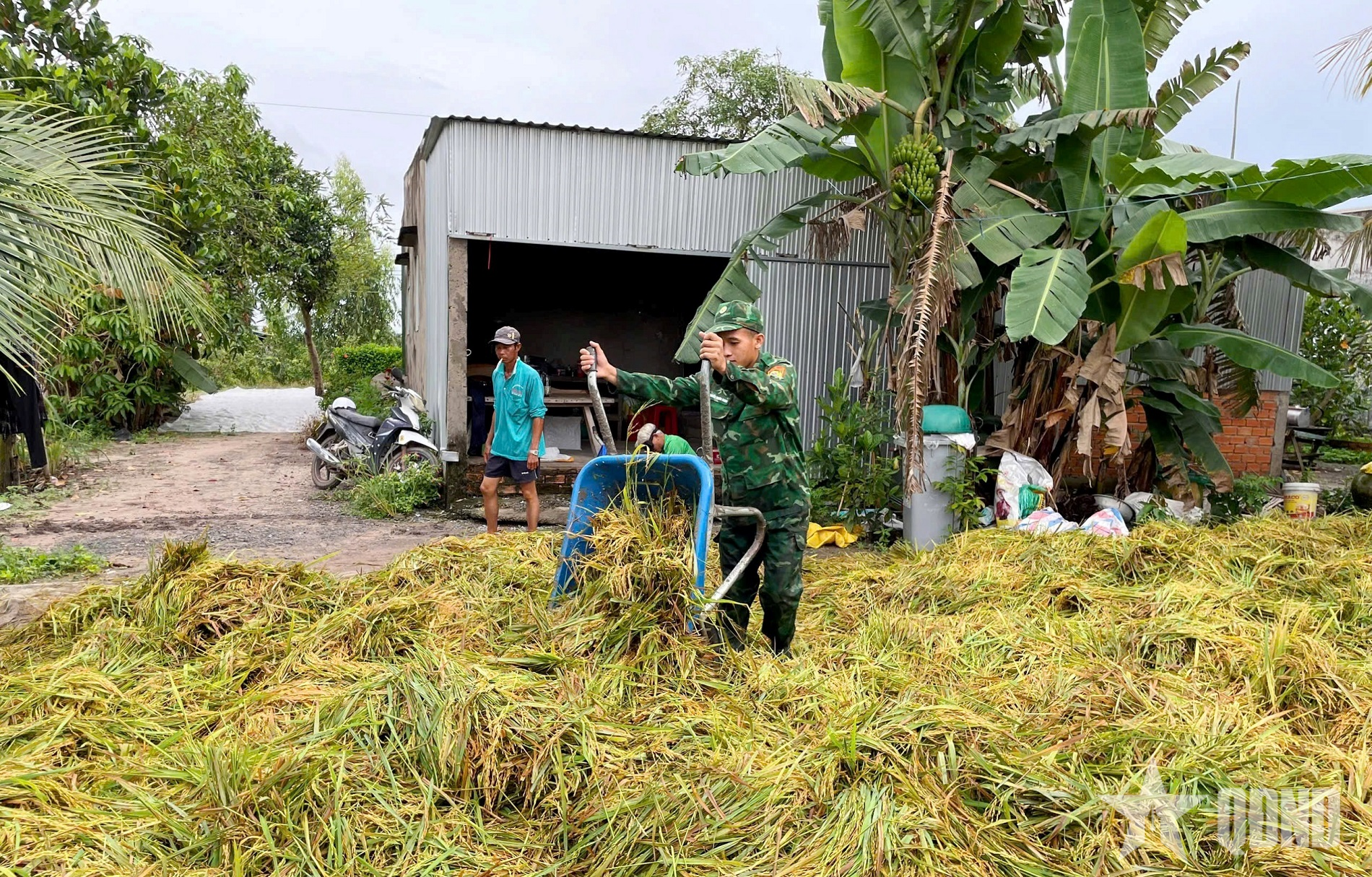 ຢູ່ເຂດທົ່ງນາຖືກນ້ຳຖ້ວມຢູ່ຕາແສງ ແຄ໋ງຮ່ວາ (ແຂວງ ໄຕນິງ ), ແຕ່ເຊົ້າວັນດຽວກັນ, ພົນທະຫານພ້ອມກັບປະຊາຊົນຢູ່ທົ່ງນາ. ນ້ຳເລິກແຕ່ຫົວເຂົ່າ, ບາງບ່ອນເລິກແອວ, ແຕ່ທຸກຄົນກະຕືລືລົ້ນທີ່ຈະເກັບກ່ຽວ. ມັດເຂົ້າໜັກຖືກມັດ, ຜ່ານຈາກມືເຖິງມືຂຶ້ນເຮືອ. ເຮືອບັນທຸກເຂົ້າໄດ້ແລ່ນໄປຢູ່ໃນຂີ້ຕົມ, ນ້ຳຕົກຢູ່ບ່ອນສູງ. ພັນເອກ ເຈີ່ນຕ໋ວນຟາດ, ຫົວໜ້າກອງບັນຊາການທະຫານ, ສະຖານີປ້ອງກັນຊາຍແດນ ລອງໂກດ ແບ່ງປັນວ່າ: “ປະຊາຊົນສ່ວນຫຼາຍຢູ່ເຂດນີ້ເຮັດໄຮ່, ຖ້າບໍ່ເກັບກ່ຽວທັນເວລາ, ເຂົ້າສຸກຈະສູນເສຍເມື່ອຖືກນໍ້າ, ພວກເຮົາພະຍາຍາມຊ່ວຍປະຊາຊົນໃຫ້ໄວທີ່ສຸດເພື່ອນໍາເຂົ້າກັບບ້ານ”.