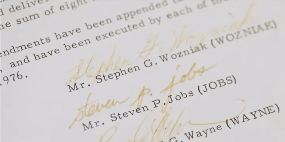 ເອກະສານສາມຫນ້າ, ເຊັນໂດຍ Steve Jobs, Steve Wozniak ແລະ Ron Wayne, ກໍານົດການເປັນເຈົ້າຂອງເບື້ອງຕົ້ນຂອງ Apple ຢູ່ທີ່ 45%, 45% ແລະ 10%. "ນີ້ແມ່ນເອກະສານພື້ນຖານຂອງປະຫວັດສາດທາງດ້ານການເງິນ, ສັງຄົມແລະເຕັກໂນໂລຢີ," Richard Austin, ຫົວຫນ້າຫນັງສືແລະຫນັງສືໃບລານຂອງ Sotheby's New York ກ່າວ.
