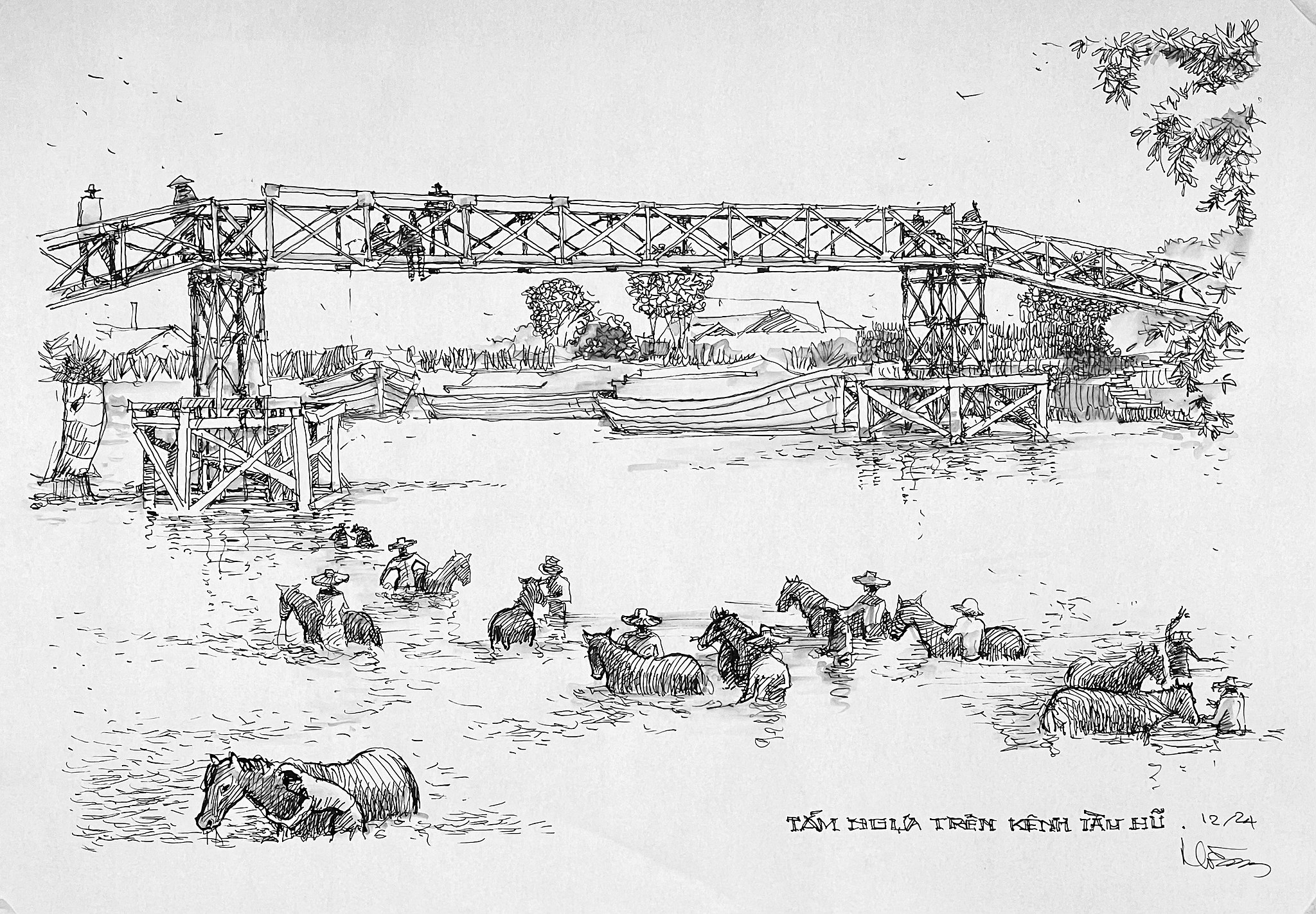ເຮືອດອກໄມ້ມາເຖິງທ່າເຮືອ ບິ່ງດົ່ງ ໃນລະຫວ່າງ ເທດສະບານ - ແຕ້ມໂດຍສະຖາປະນິກ Phan Dinh Trung