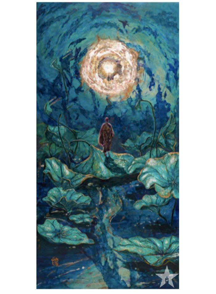 | "ກິ່ນຫອມທີ່ງຽບສະຫງົບ" ສະແດງໃຫ້ເຫັນຮູບພາບຂອງນາຍ Zen ຢືນຢູ່ໃນຂັ້ນຕອນຂອງໃບ lotus ທີ່ສະຫງ່າງາມພາຍໃຕ້ແສງເດືອນທີ່ລຶກລັບ. |