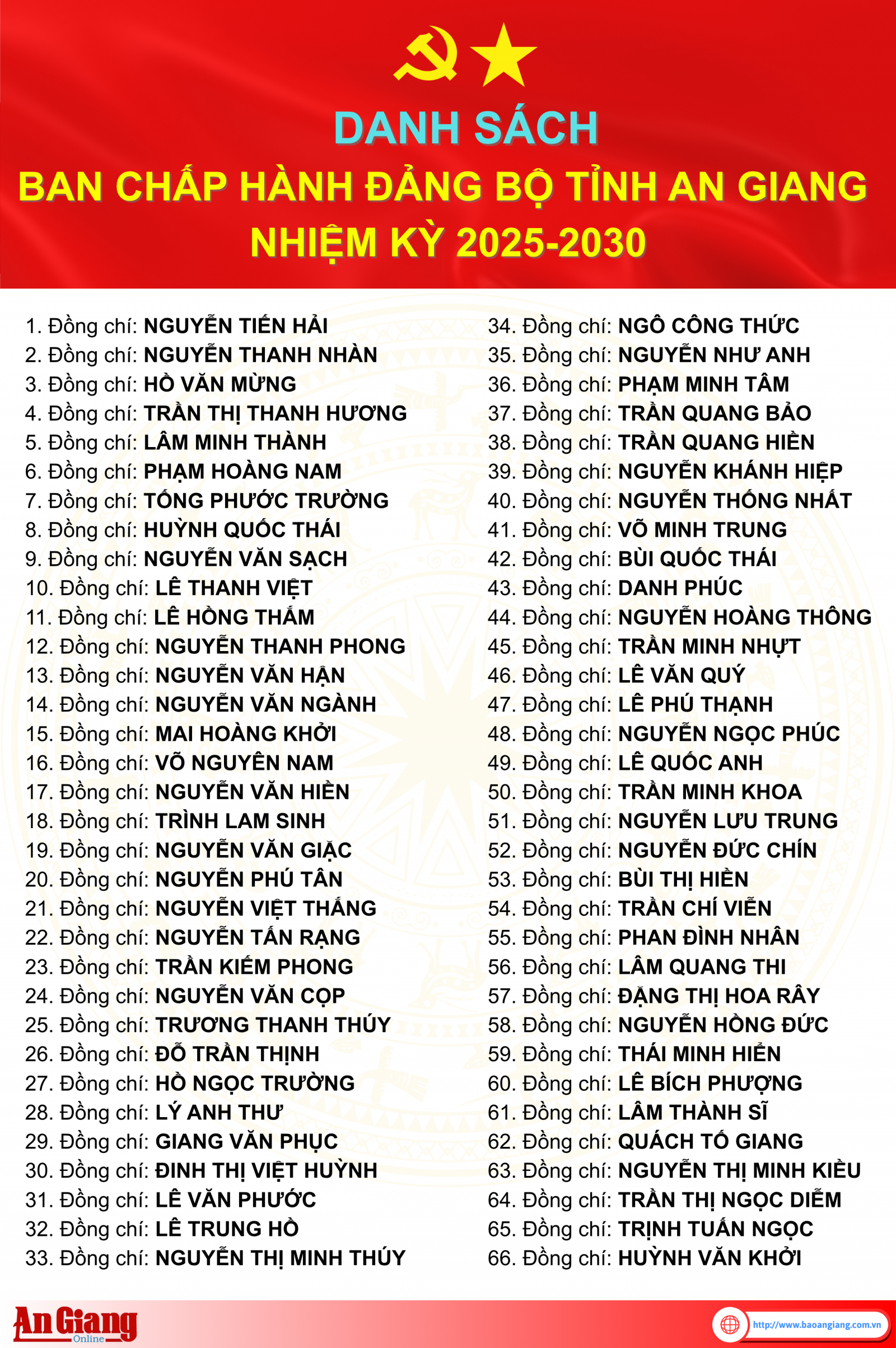 ຕອນເຊົ້າວັນທີ 3/10, ທີ່ກອງປະຊຸມໃຫຍ່ຄັ້ງທີ 1 ຂອງຄະນະບໍລິຫານງານພັກແຂວງ ອານຢາງ ອາຍຸການ 2025-2030, ມະຕິເລກທີ 2349-QDNS/TW, ລົງວັນທີ 15/9/2025 ຂອງກົມການເມືອງ, ໄດ້ປະກາດແຕ່ງຕັ້ງສະຫາຍ 66 ສະຫາຍເຂົ້າຮ່ວມຄະນະບໍລິຫານງານພັກແຂວງ ອານຢາງ ຊຸດທີ 2025 ອາຍຸການ 2025 ທ່ານ; ແຕ່ງຕັ້ງ 16 ສະຫາຍ ເຂົ້າຮ່ວມຄະນະປະຈຳພັກແຂວງ ອານຢາງ ໄລຍະ 2025 – 2030.