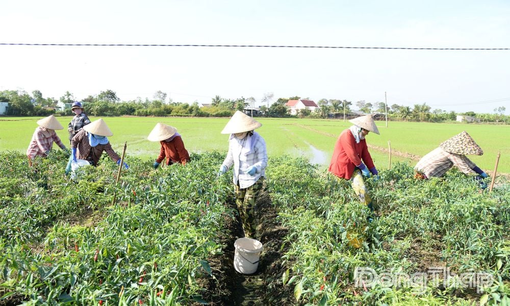 ຄອບຄົວຂອງນາງ ເຢືອງທິກິມງາ (ບ້ານກິງເຈີນ, ຕາແສງເຕິນດຽນ, ແຂວງດົ່ງທາບ) ປູກໝາກເຜັດໃນເນື້ອທີ່ 2.2 ເຮັກຕາ. ເມື່ອພວກເຮົາມາຮອດ, ນາງງາ ແລະ ກຳມະກອນຂອງນາງກຳລັງເກັບກ່ຽວໝາກເຜັດຢ່າງຫຍຸ້ງຢູ່ເພື່ອຂາຍໃຫ້ພໍ່ຄ້າ. ອີງຕາມນາງງາ, ສວນໝາກເຜັດຂອງຄອບຄົວນາງໄດ້ຮອດລະດູເກັບກ່ຽວປະມານເຄິ່ງເດືອນກ່ອນ. ມາຮອດປະຈຸບັນ, ນາງໄດ້ເກັບກ່ຽວ 7 ຄັ້ງ, ສະເລ່ຍ 2 ມື້ລະຄັ້ງ.