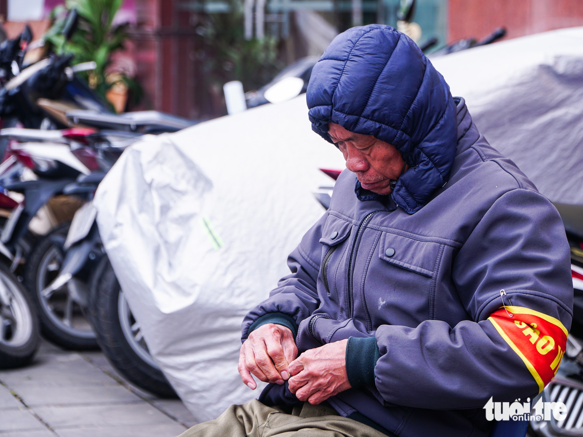 ເຮັດວຽກເປັນຍາມຮັກສາຄວາມປອດໄພ, ມັກຢືນຢູ່ນອກອາກາດໜາວ, ທ່ານ ຮ່ວາງ (ອາຍຸ 59 ປີ, ຮ່າໂນ້ຍ) ໃຫ້ຮູ້ວ່າ: “ອາກາດຢູ່ຮ່າໂນ້ຍ ໃນທຸກມື້ນີ້ແມ່ນໜາວຫຼາຍ, ມີລົມແຮງ ແລະ ບາງເທື່ອຝົນຕົກ, ສະນັ້ນ ການອອກແຮງງານຢູ່ນອກແມ່ນຫຍຸ້ງຍາກ, ເພື່ອປ້ອງກັນຄວາມໜາວ, ໃນມື້ນີ້ ຂ້າພະເຈົ້າໄດ້ໃສ່ເສື້ອຜ້າອຸ່ນ 3 ຜືນ, ມີໝວກຝ້າຍປົກຫົວ ແລະ ຫູ.