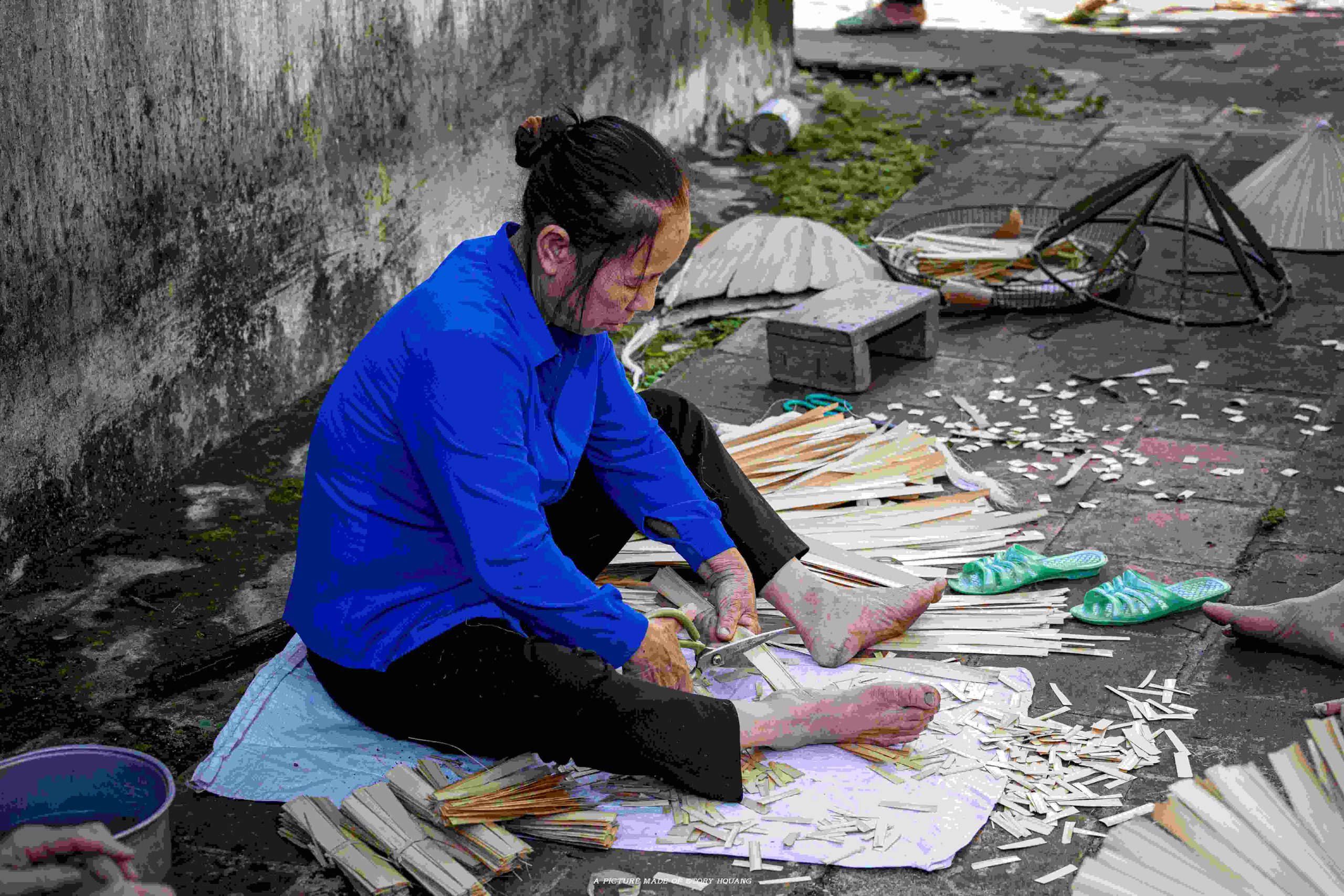 ມາ Tri Le, ແຂກທ່ອງທ່ຽວສາມາດເຫັນເຮືອນທຸກຫຼັງເຮັດໝວກຮູບຈວຍໄດ້ງ່າຍ. ຖະໜົນຫົນທາງຂອງໝູ່ບ້ານຖືກຍ້ອມດ້ວຍສີຂາວດ້ວຍສີຂອງໃບຕານແຫ້ງ, ເດີ່ນແມ່ນຄຶກຄັກດ້ວຍສຽງຂອງການຕັດໝວກຮູບຈວຍ, ແລະ ບາງຄັ້ງກໍເຫັນລົດຈັກທີ່ຖືໝວກຮູບຈວຍໄປຂາຍ. ພາບ: ຫງວຽນຮົ່ງກວາງ