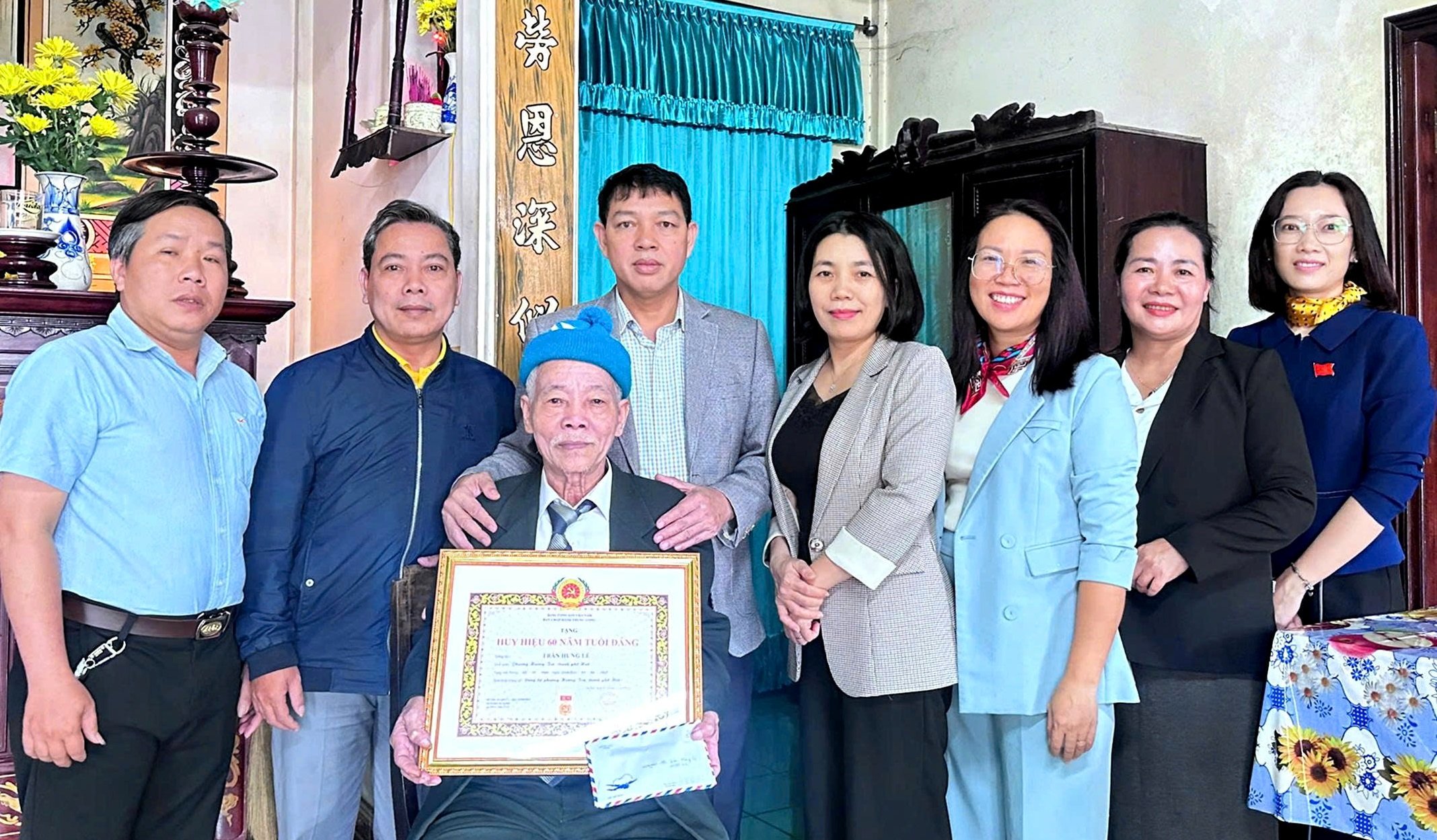 ຍ້ອນດິນຟ້າອາກາດບໍ່ສະດວກ, ຕອນເຊົ້າວັນທີ 6/11, ທ່ານ ຫງວຽນວັນຮຸ່ງ, ເລຂາທິການໃຫຍ່ຄະນະບໍລິຫານງານສູນກາງພັກ ຮ່ວາງຈູງຮ່ວາງ ໄດ້ມາອວຍພອນ ແລະ ມອບໃບຍ້ອງຍໍສະມາຊິກພັກ 60 ປີ ຢູ່ເຮືອນສ່ວນຕົວຂອງບັນດາສະມາຊິກພັກຄື: ເຈີ່ນຮົ່ງເລີ, ຫວູທິທູ, ເລວັນອຽນ.