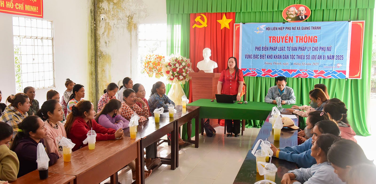 ຕອນເຊົ້າວັນທີ 28 ພະຈິກນີ້, ສະຫະພັນແມ່ຍິງຕາແສງ ເຈືອງແທ່ງ ໄດ້ລົງເຄື່ອນໄຫວໂຄສະນາກົດໝາຍ ແລະ ໃຫ້ຄຳປຶກສາດ້ານກົດໝາຍໃຫ້ແກ່ແມ່ຍິງໝູ່ບ້ານ Giong Ke.