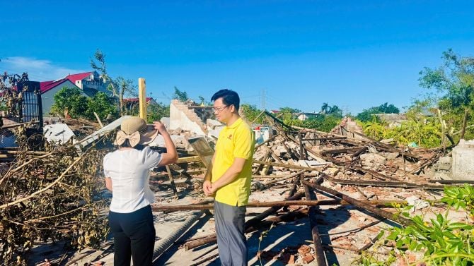 ຜູ້ຕາງໜ້າກອງທຶນ Thien Tam ແບ່ງປັນກັບປະຊາຊົນ Ninh Binh ພາຍຫຼັງການສູນເສຍ ແລະຄວາມເສຍຫາຍຈາກພະຍຸເລກ 10.