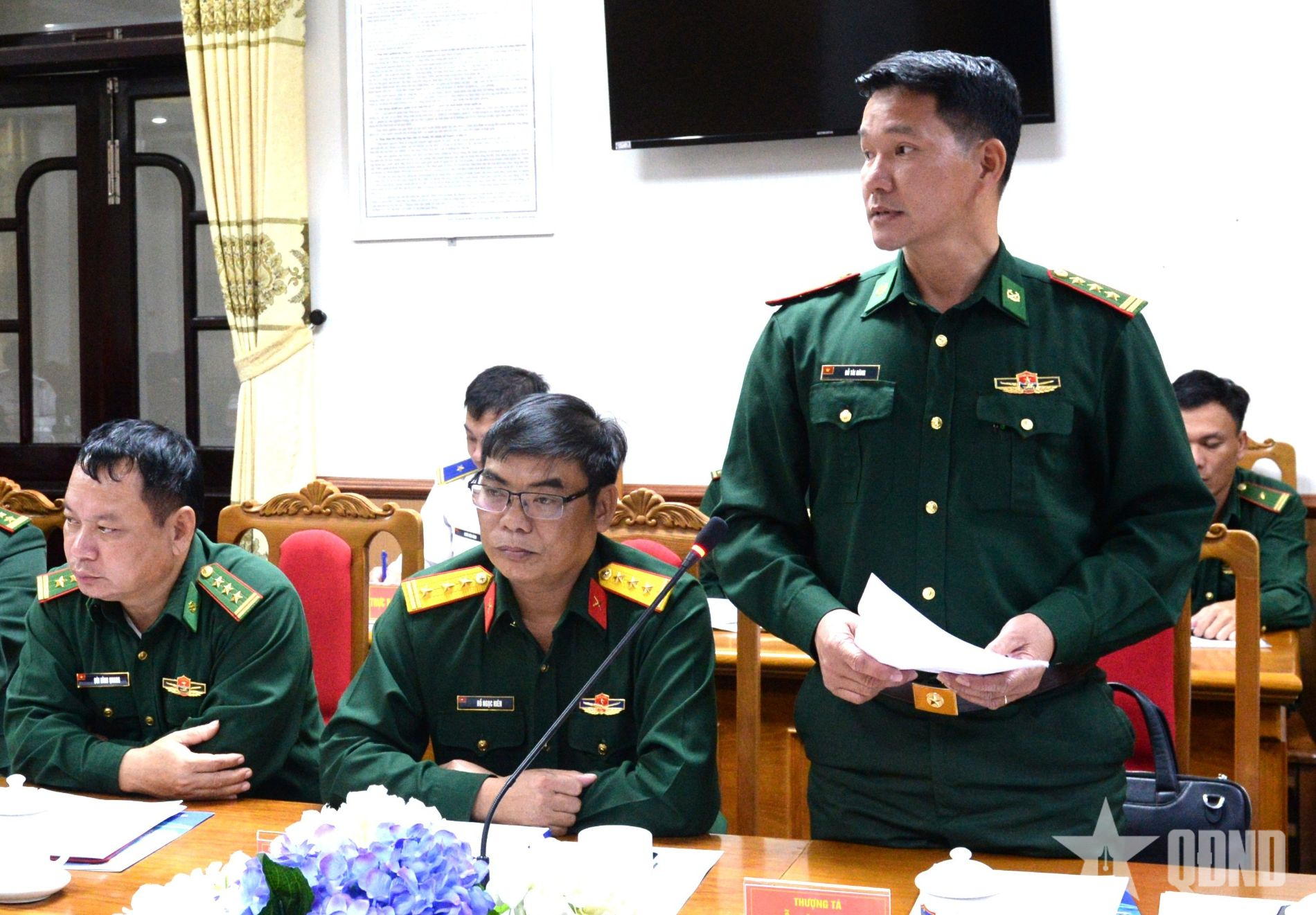 ທ່ານພົນຈັດຕະວາ ເຈີ່ນກວາງຕ໋ວນ, ຜູ້ບັນຊາການທະຫານປ້ອງກັນຝັ່ງທະເລເຂດ 2 ກ່າວຄຳເຫັນທີ່ກອງປະຊຸມ. |