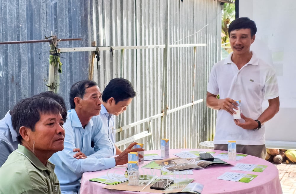 ບັນດານັກທຸລະກິດ ແລະຊາວກະສິກອນປຶກສາຫາລືກ່ຽວກັບຂະບວນການນໍາໃຊ້ຝຸ່ນຊີວະພາບ.