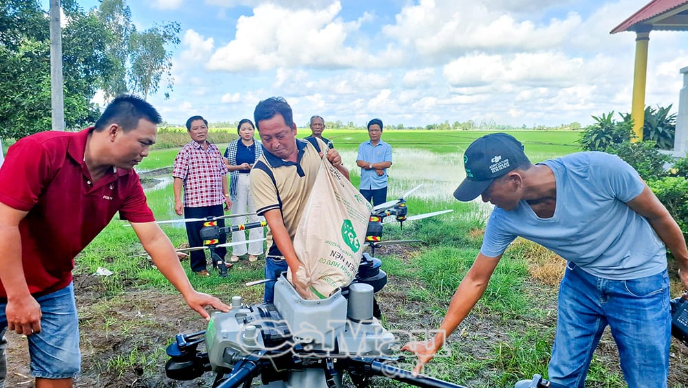 ຊາວກະສິກອນໃຊ້ drones ເພື່ອນໍາໃຊ້ຝຸ່ນຊີວະພາບ.