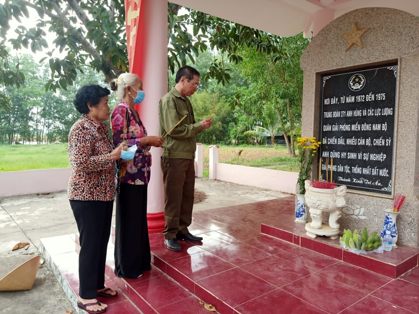 Tác giả Vương Khả Sơn cùng chị Nguyễn Thị Riêng và Nguyễn Thị Bòi thắp hương tại Nhà bia tưởng niệm liệt sĩ Trung đoàn 271, xã An Ninh Tây, huyện Đức Hòa
