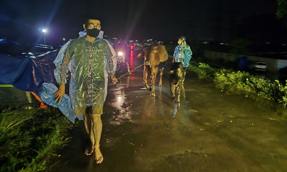Bà con đưa vật nuôi lên vị trí cao hơn để tránh lũ. |