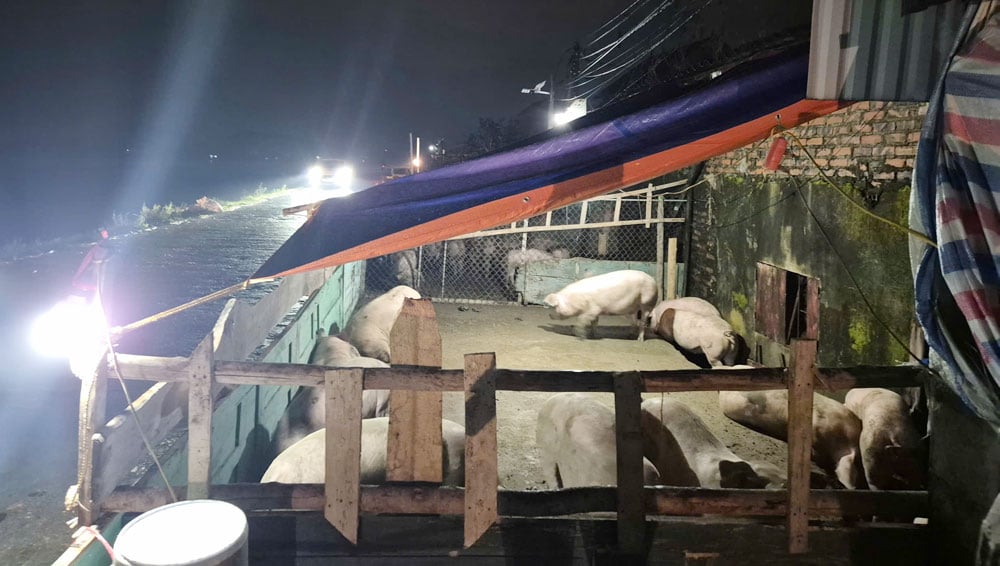 Đàn lợn của người dân được di chuyển lên đê. |