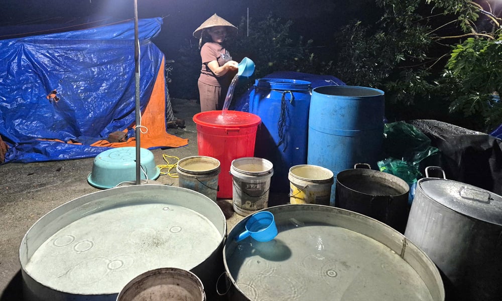 Hàng chục thùng nước được người dân dự trữ để phục vụ sinh hoạt. |