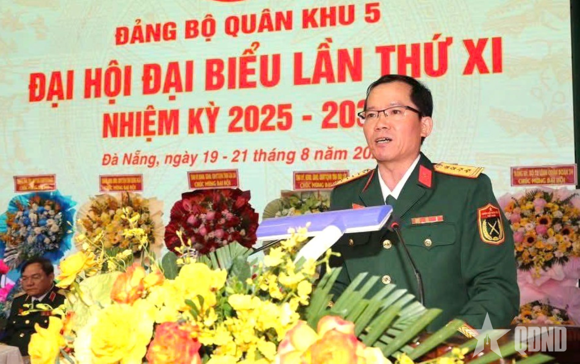 Đại tá Lương Đình Chung, Bí thư Đảng ủy, Chính ủy Quân khu 5 phát biểu tại Đại hội đại biểu Đảng bộ Quân khu 5 lần thứ XI nhiệm kỳ 2025-2030. |