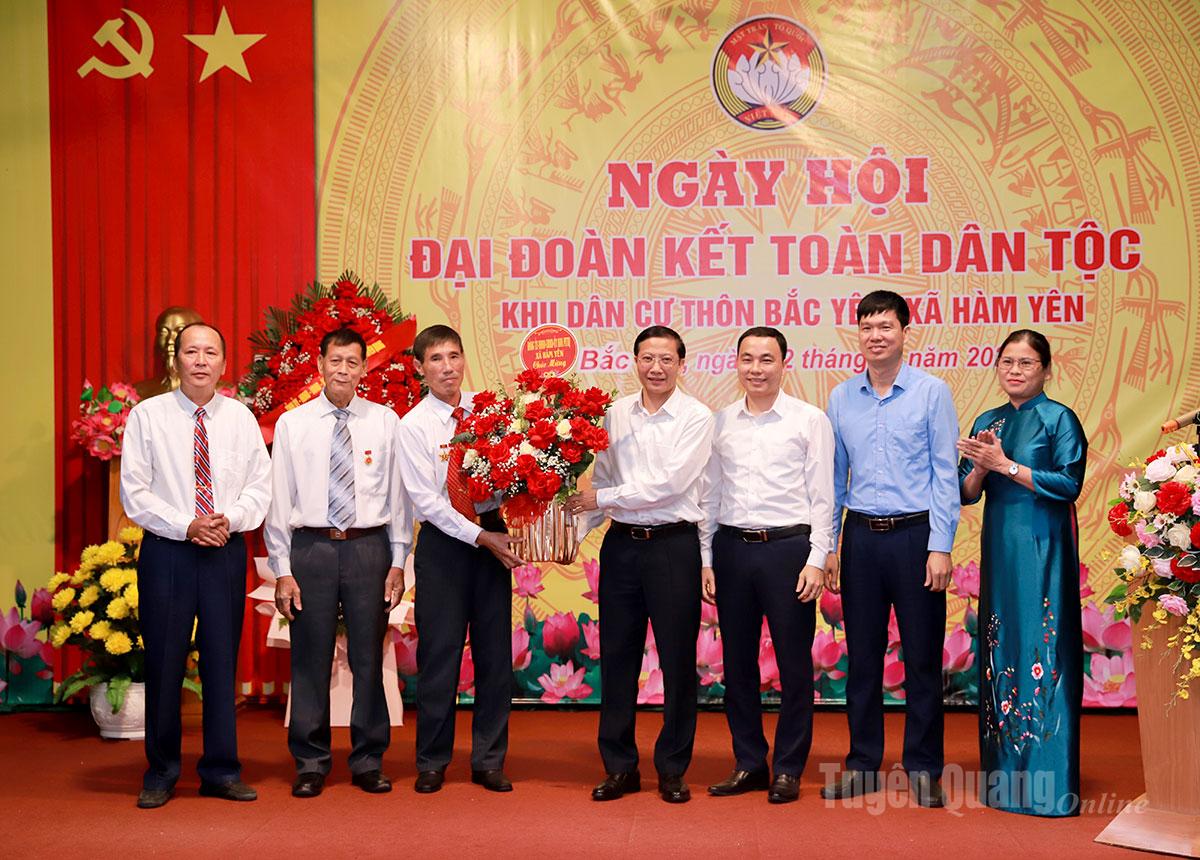 | Pemimpin Jawatankuasa Parti, Majlis Rakyat, Jawatankuasa Rakyat dan Jawatankuasa Front Tanah Air komune Ham Yen menyampaikan bunga untuk mengucapkan tahniah kepada kampung Bac Yen. |