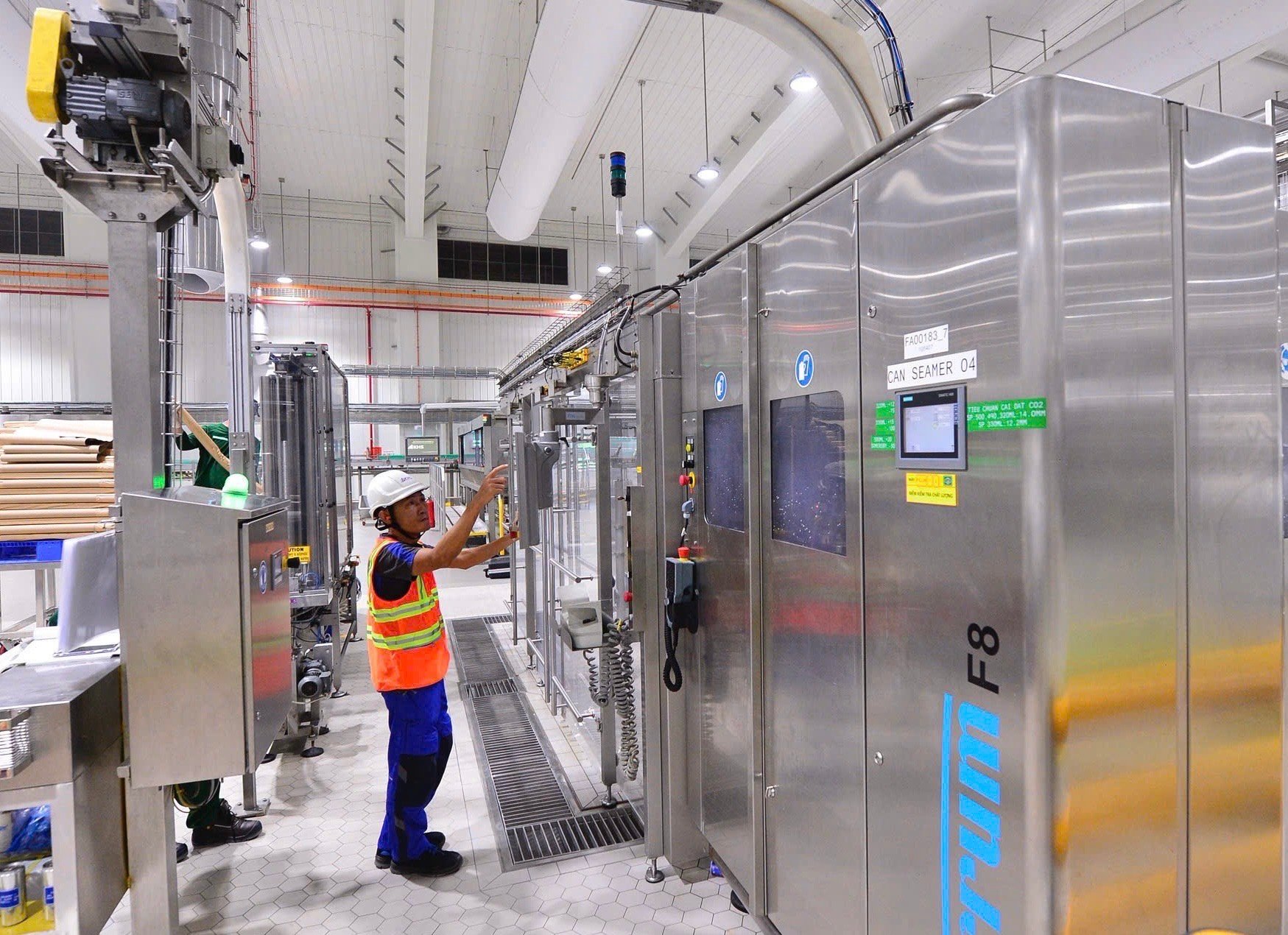 | Pekerja memeriksa barisan pengeluaran di Syarikat Bir Phu Bai. Foto: Nhat Linh |