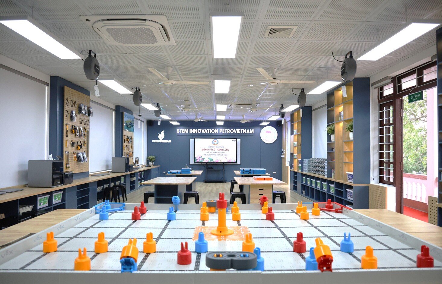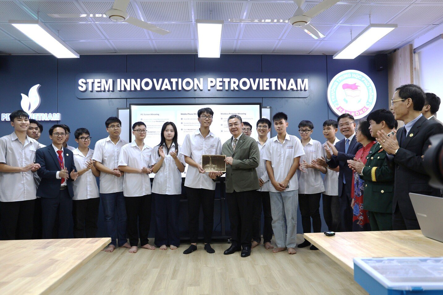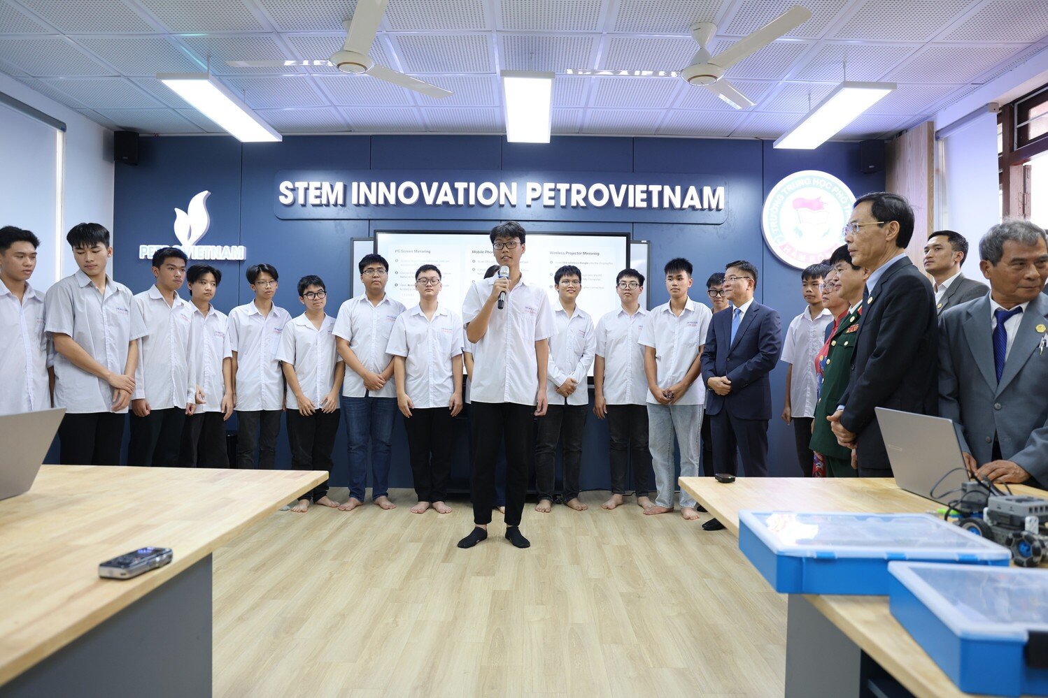 Bilik Pendidikan Praktikal Inovasi STEM Petrovietnam telah digunakan secara rasmi dengan kehadiran pemimpin Kerajaan, pemimpin Petrovietnam, pemimpin wilayah Thanh Hoa dan komuniti sekolah. Ini adalah ruang pembelajaran moden, direka mengikut piawaian antarabangsa NGSS, ISTE, CSTA, memenuhi sepenuhnya keperluan untuk pengajaran antara disiplin, amalan eksperimen dan penyelidikan saintifik pelajar.