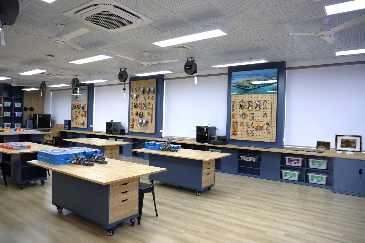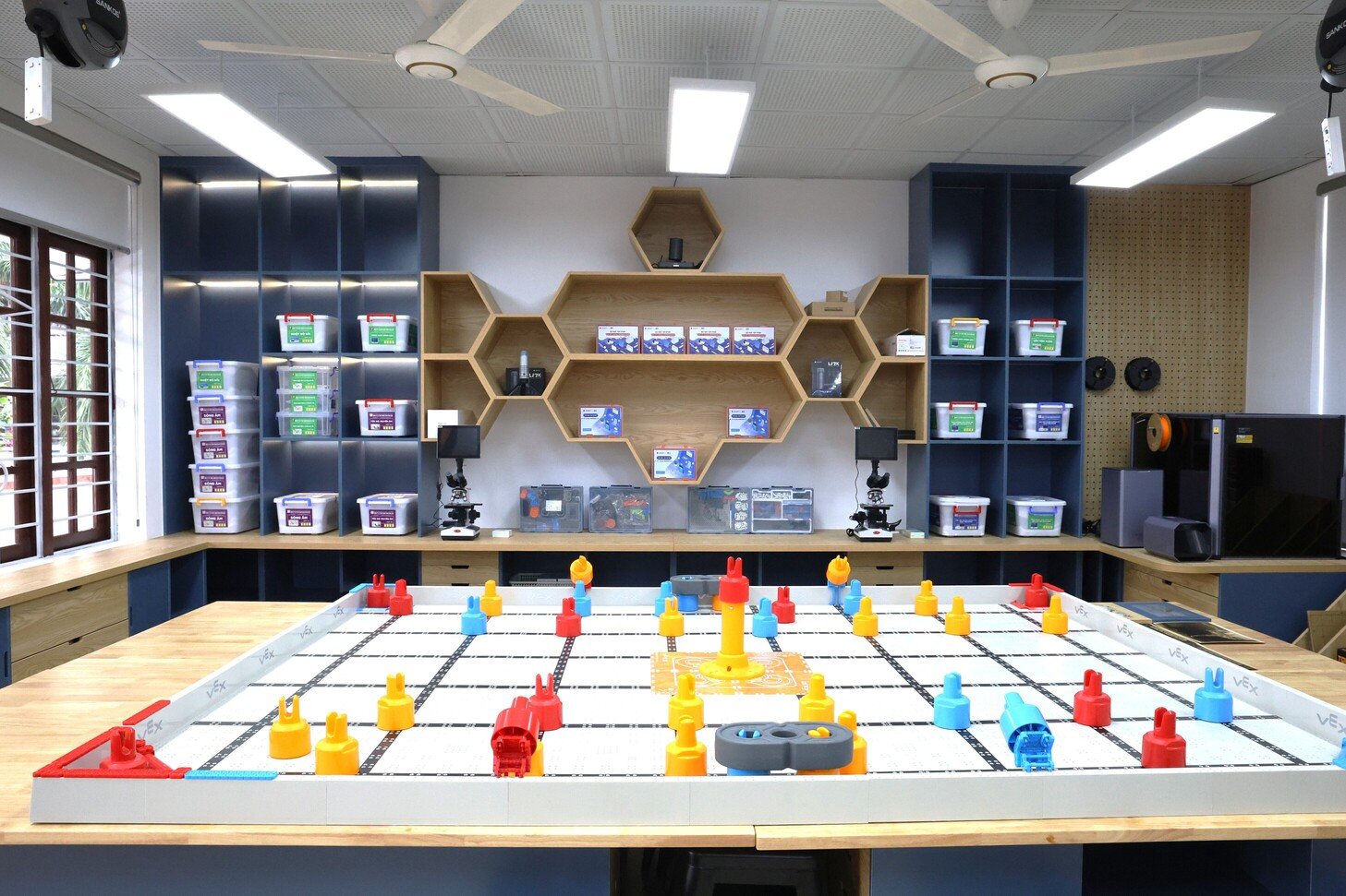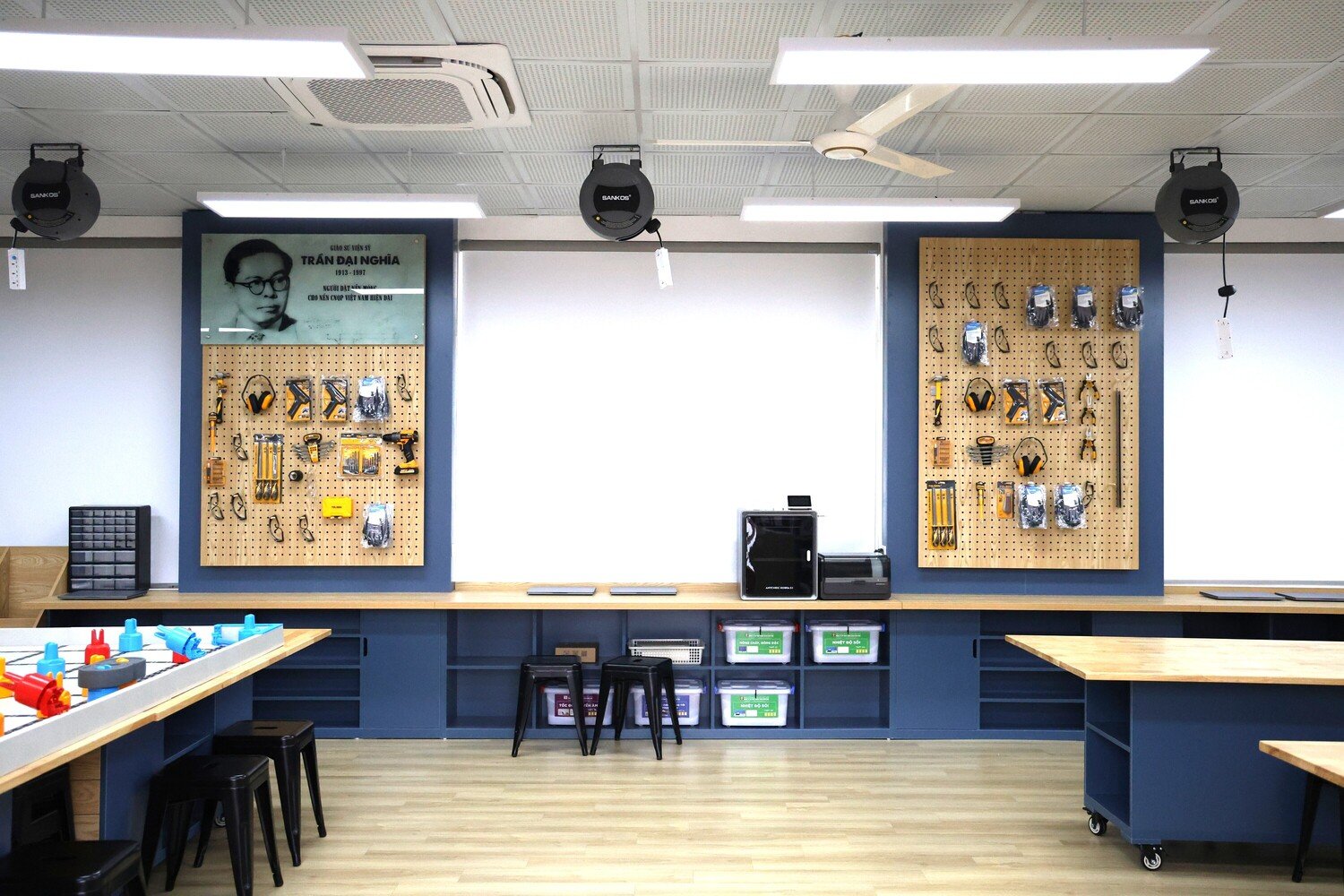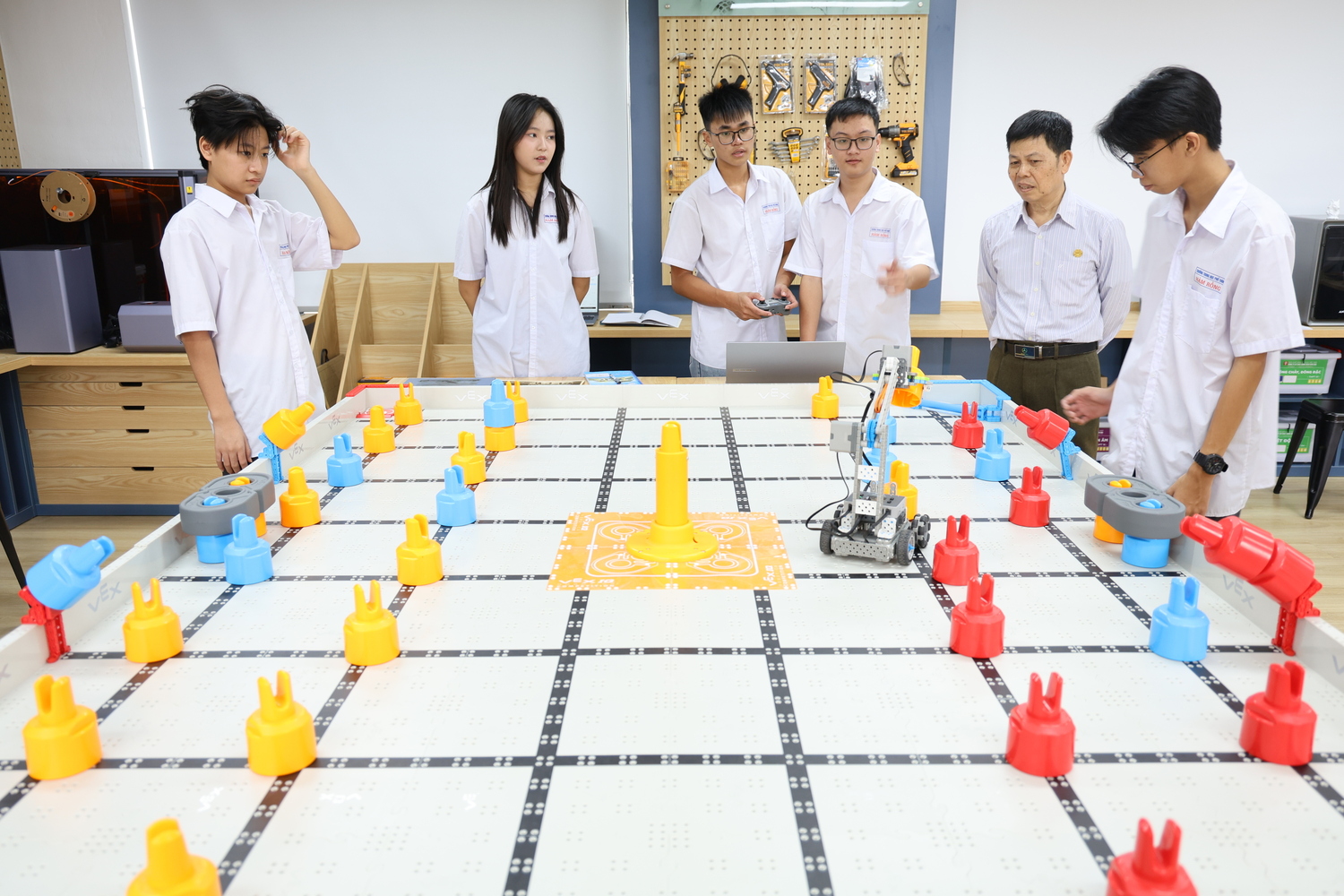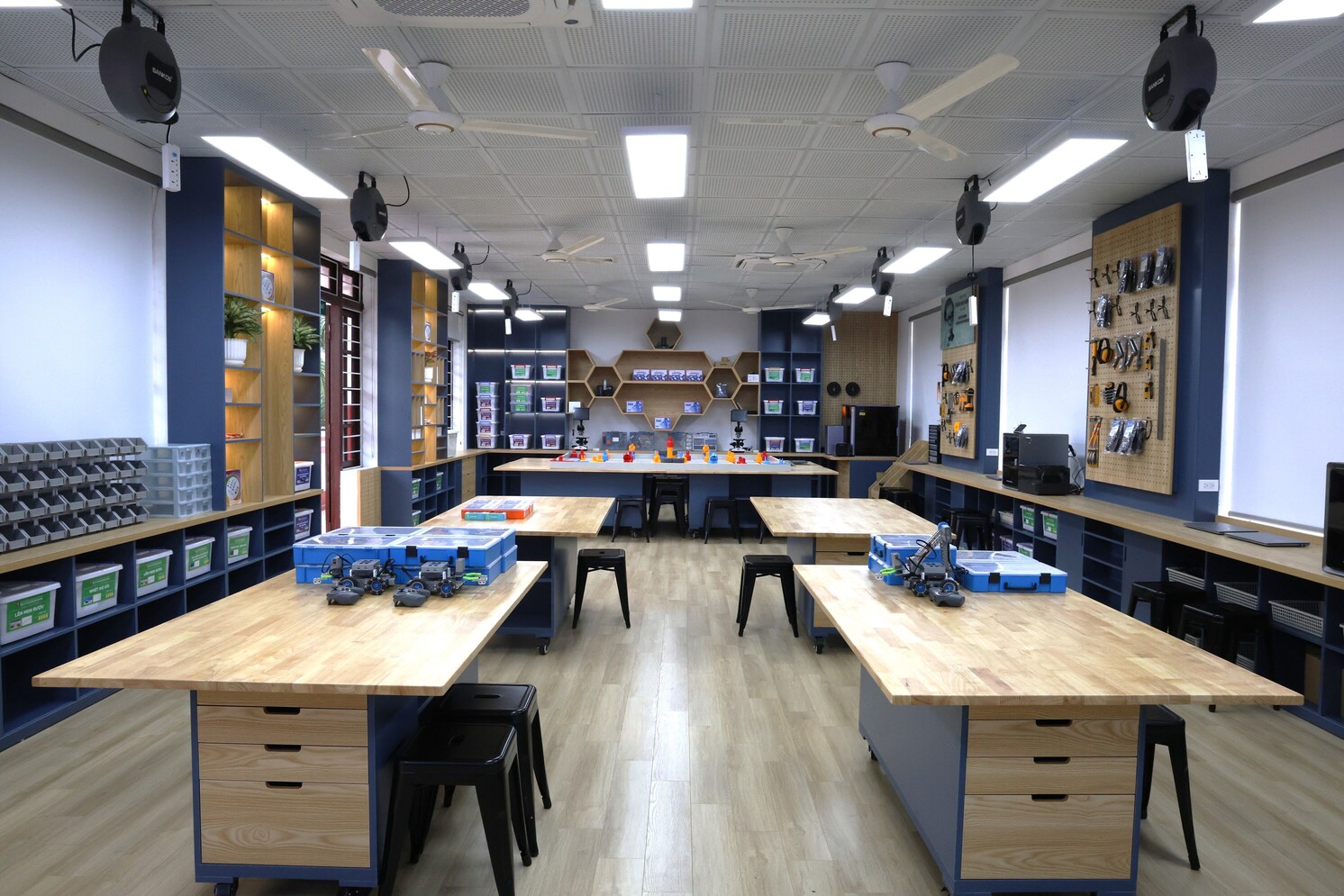 Bilik darjah dilengkapi dengan 6 blok berfungsi, termasuk: skrin interaktif 86 inci, sistem persidangan dalam talian, komputer pengaturcaraan AI-IoT, robot VEX, pencetak 3D, mesin pemotong CNC, set eksperimen topik persekitaran tenaga, bersama-sama dengan bahan pembelajaran digital dan sistem pengurusan kelas lanjutan. Model ini dibina dengan matlamat untuk mewujudkan persekitaran pembelajaran yang intuitif dan praktikal, menyokong pembentukan pemikiran saintifik, teknikal dan kreatif untuk pelajar.