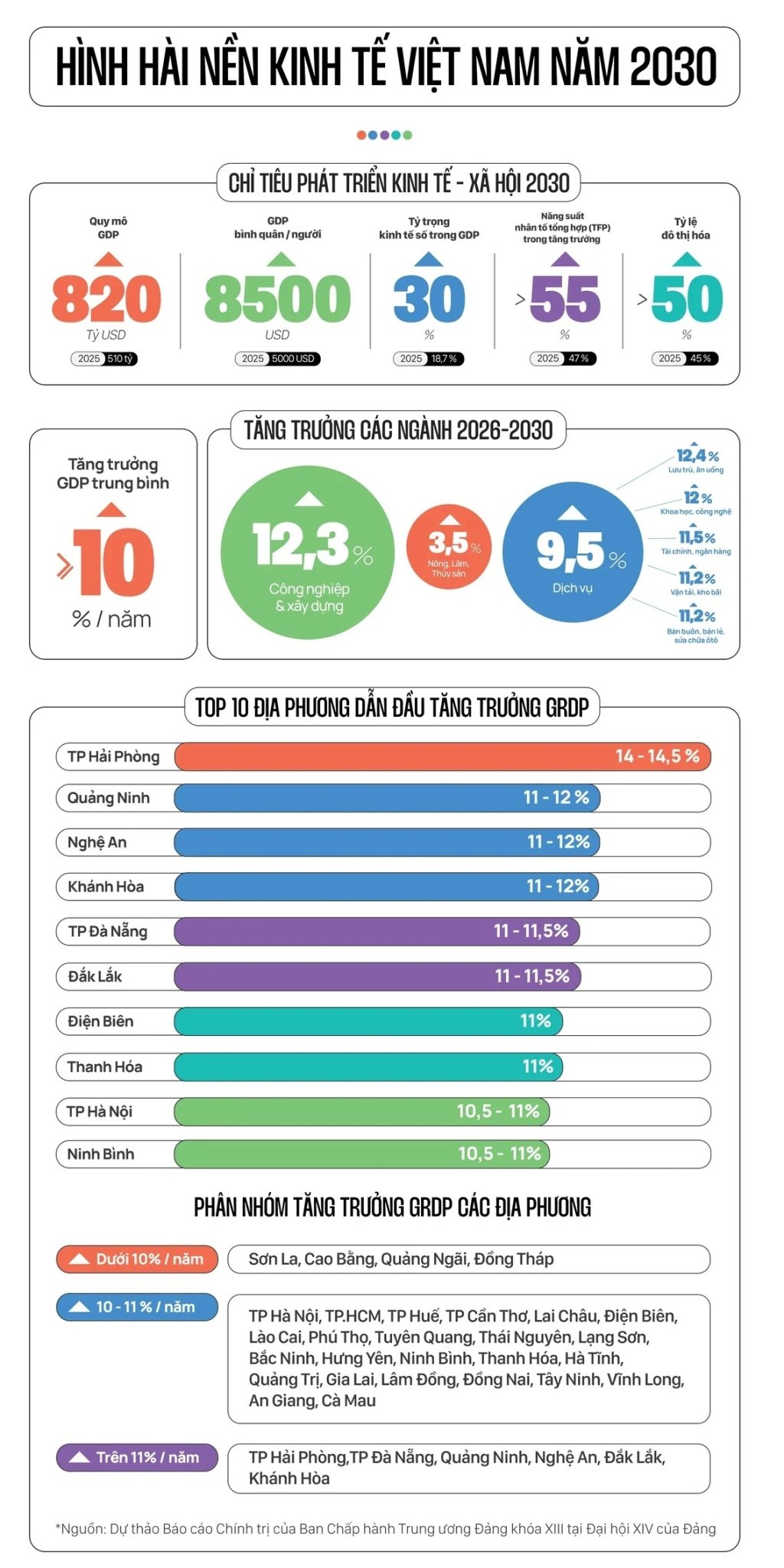 Menurut draf Laporan Politik Jawatankuasa Pusat Parti Ke-13 di Kongres Kebangsaan Ke-14, menjelang 2030, bahagian ekonomi digital dalam KDNK Vietnam akan mencapai lebih 30%, dan kadar pembandaran akan melebihi 50%.