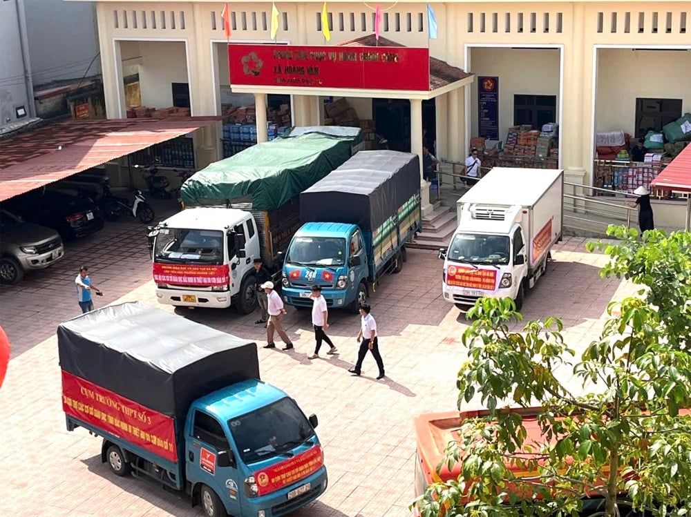 Lebih 70 trak yang membawa lebih 100 tan barangan keperluan termasuk buku, peralatan sekolah, komputer, kasut, pakaian dan keperluan diangkut terus oleh Jabatan Pendidikan dan Latihan Hanoi dan sekolah di bandar itu ke komune Hoang Van untuk disampaikan kepada kerajaan dan sekolah.