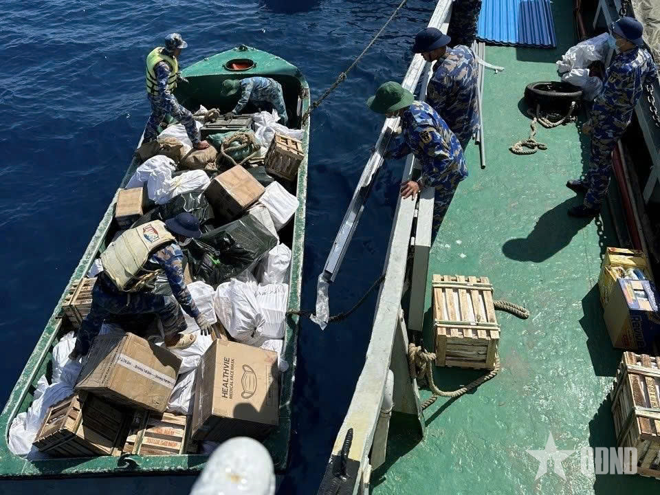| Mengangkut barang dari kapal untuk mengangkut bot untuk membekalkan pulau-pulau. Foto: QUAN HAI |