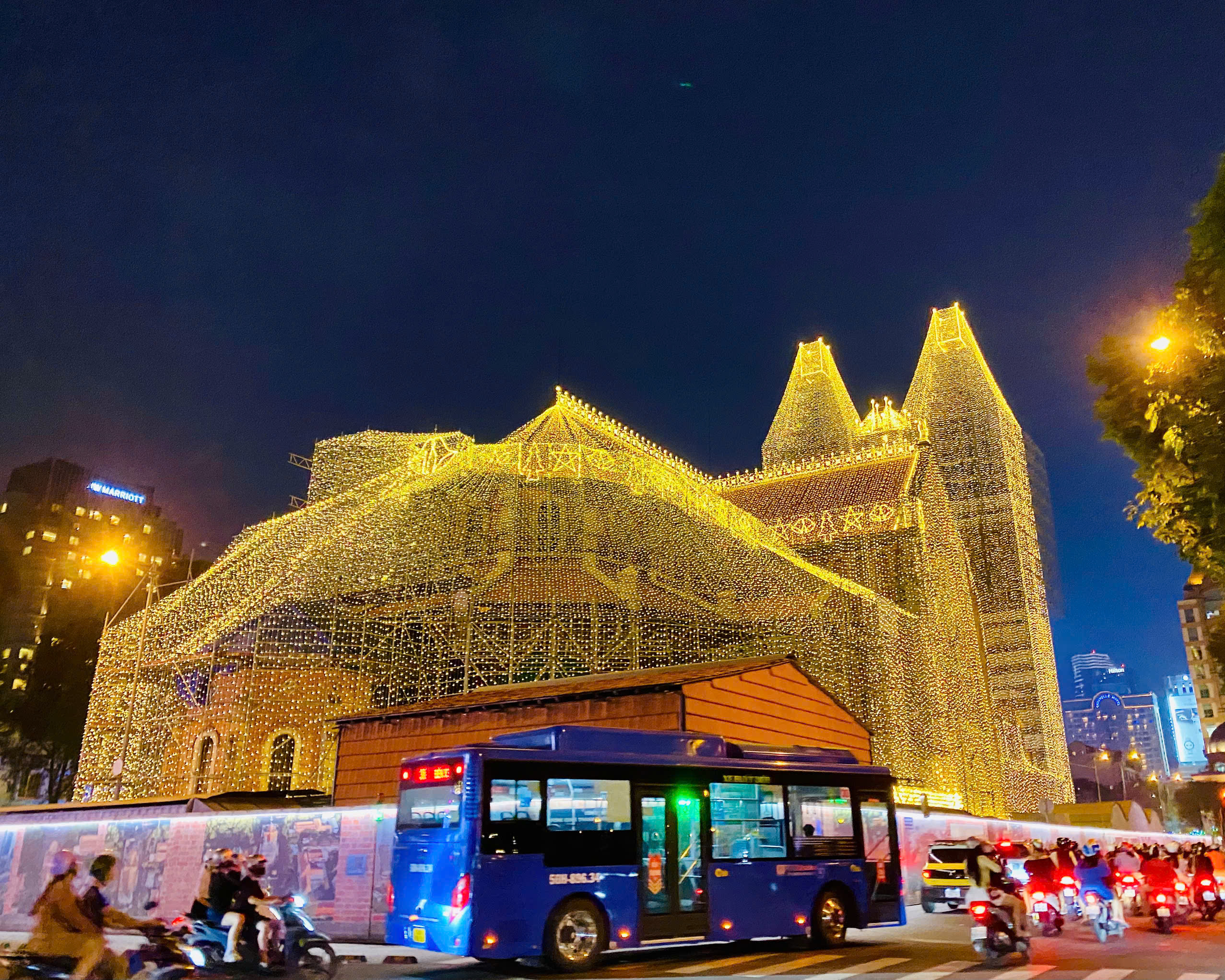 Katedral Notre Dame diterangi terang untuk Krismas. FOTO: THAO PHUONG