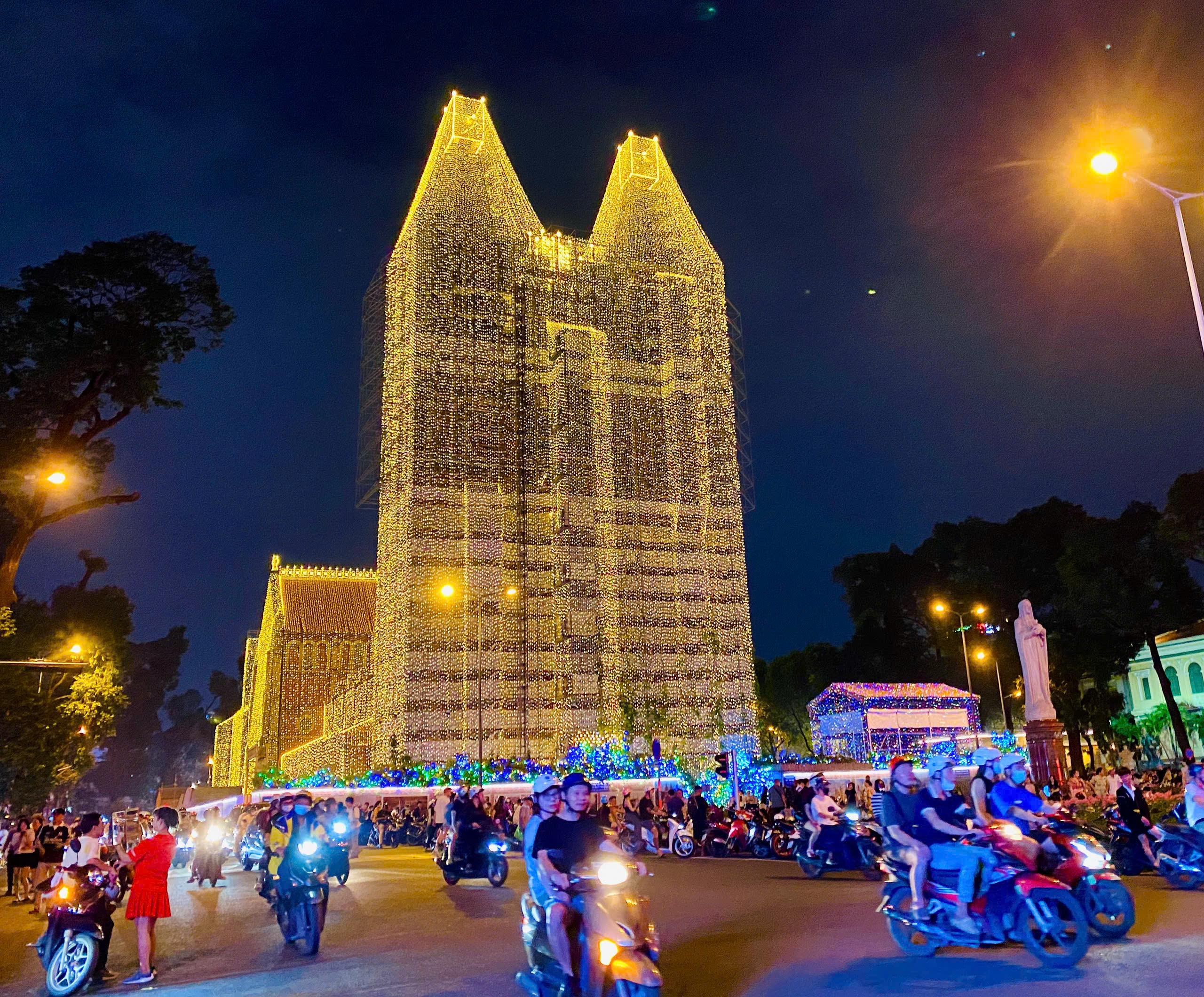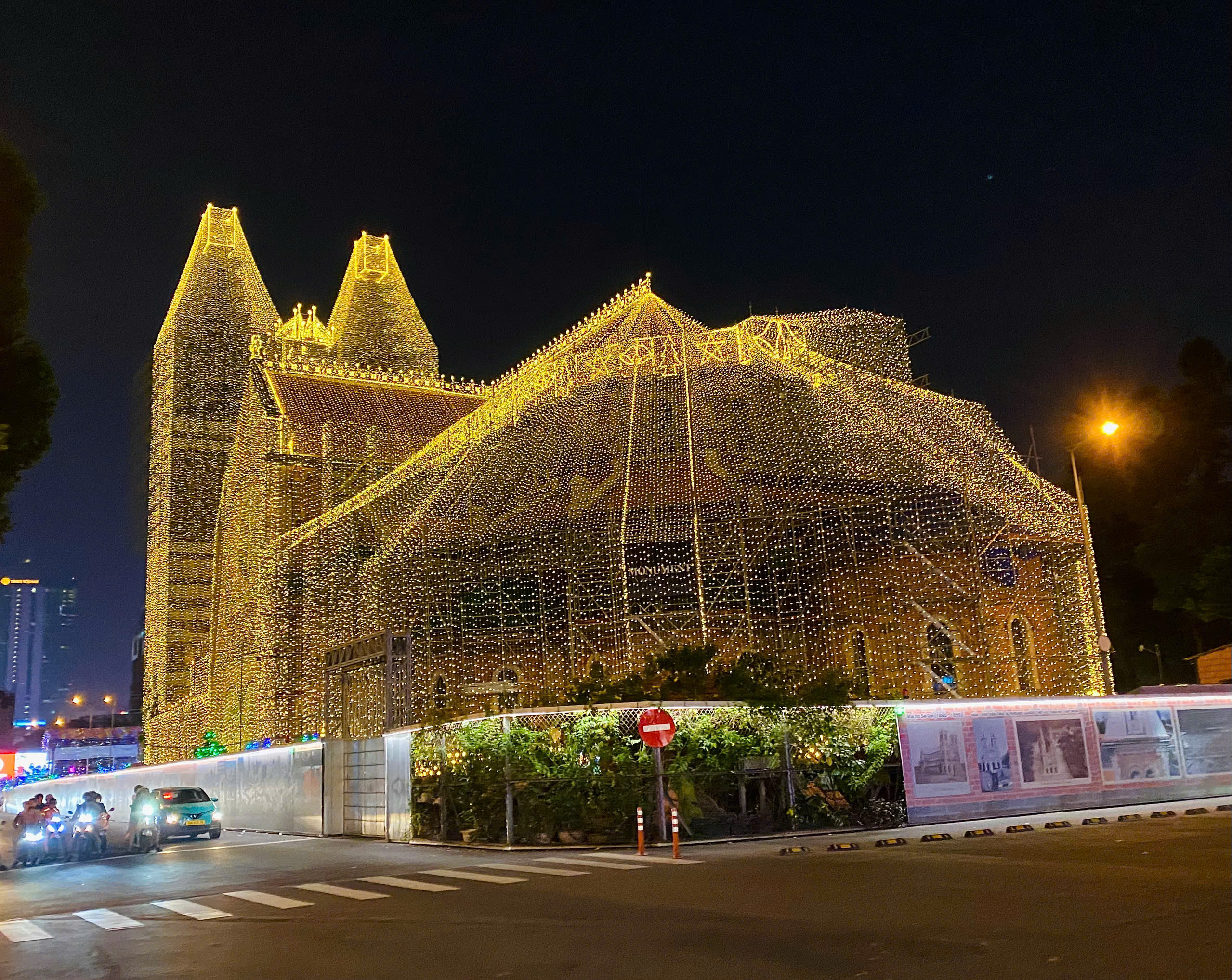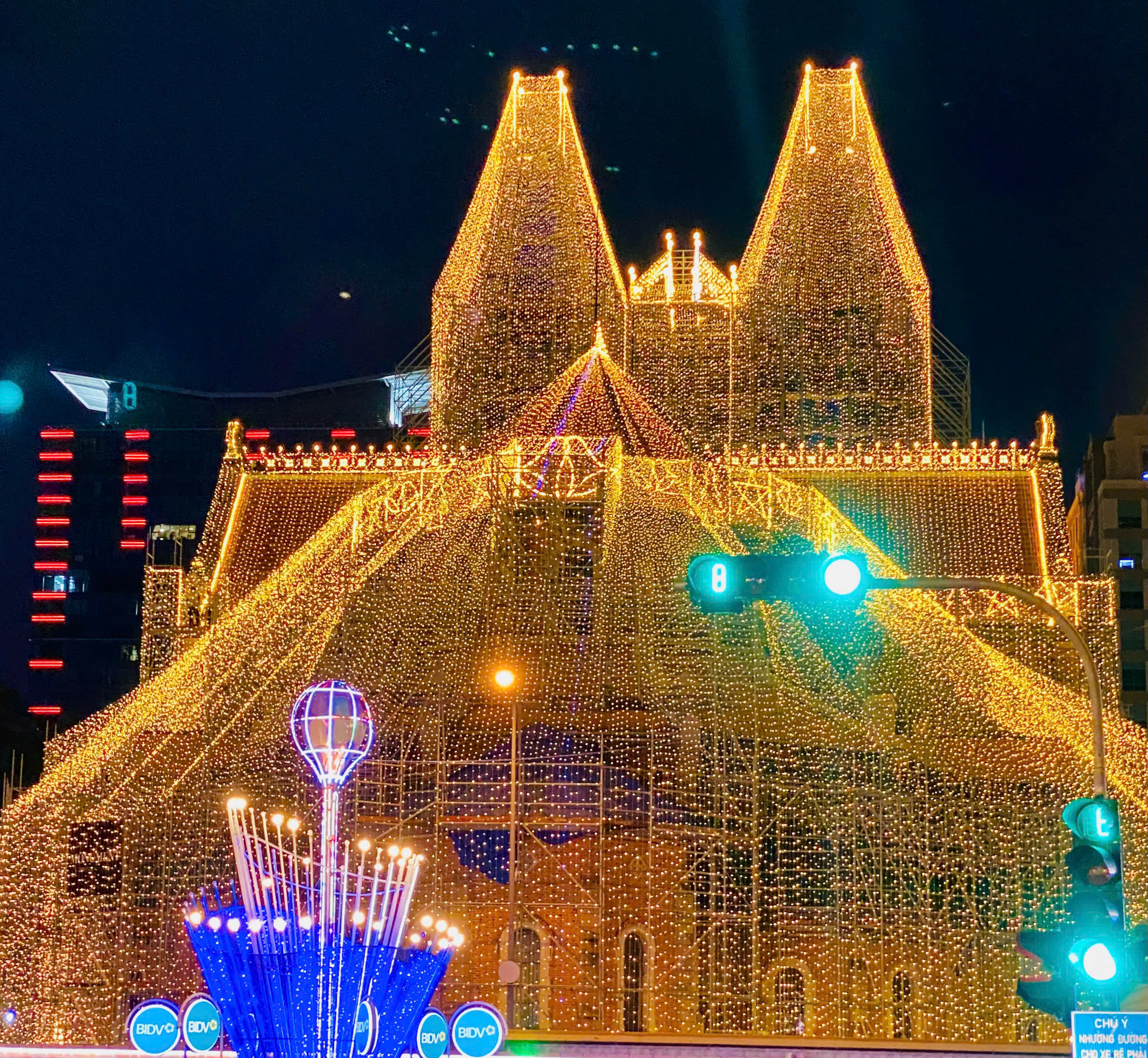 Seluruh bahagian luar gereja dilitupi lampu kuning yang berkilauan. FOTO: THAO PHUONG