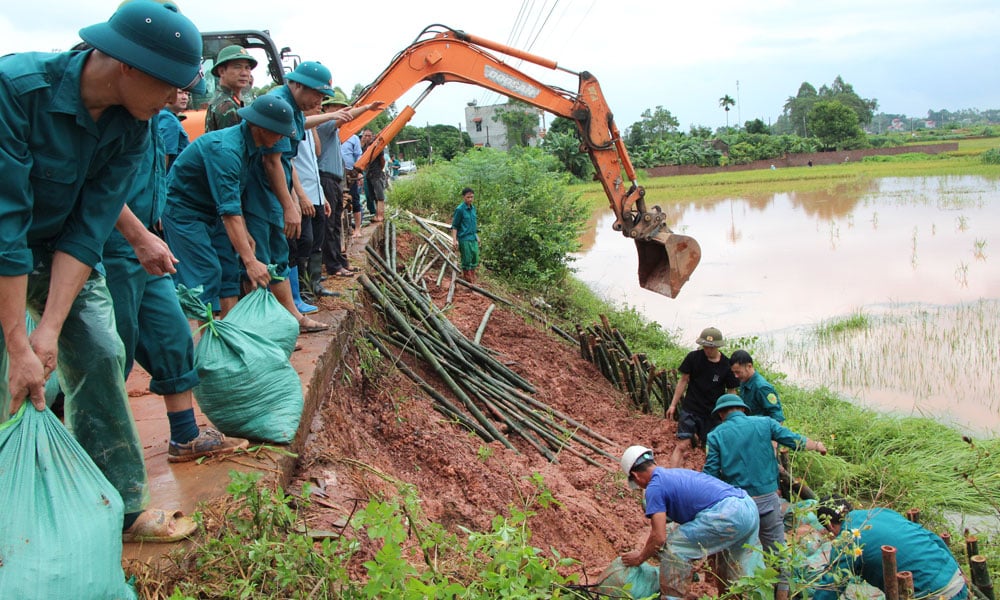 Pihak berkuasa dan orang ramai berganding bahu untuk mengatasi tanah runtuh di benteng kiri Sungai Thuong. |