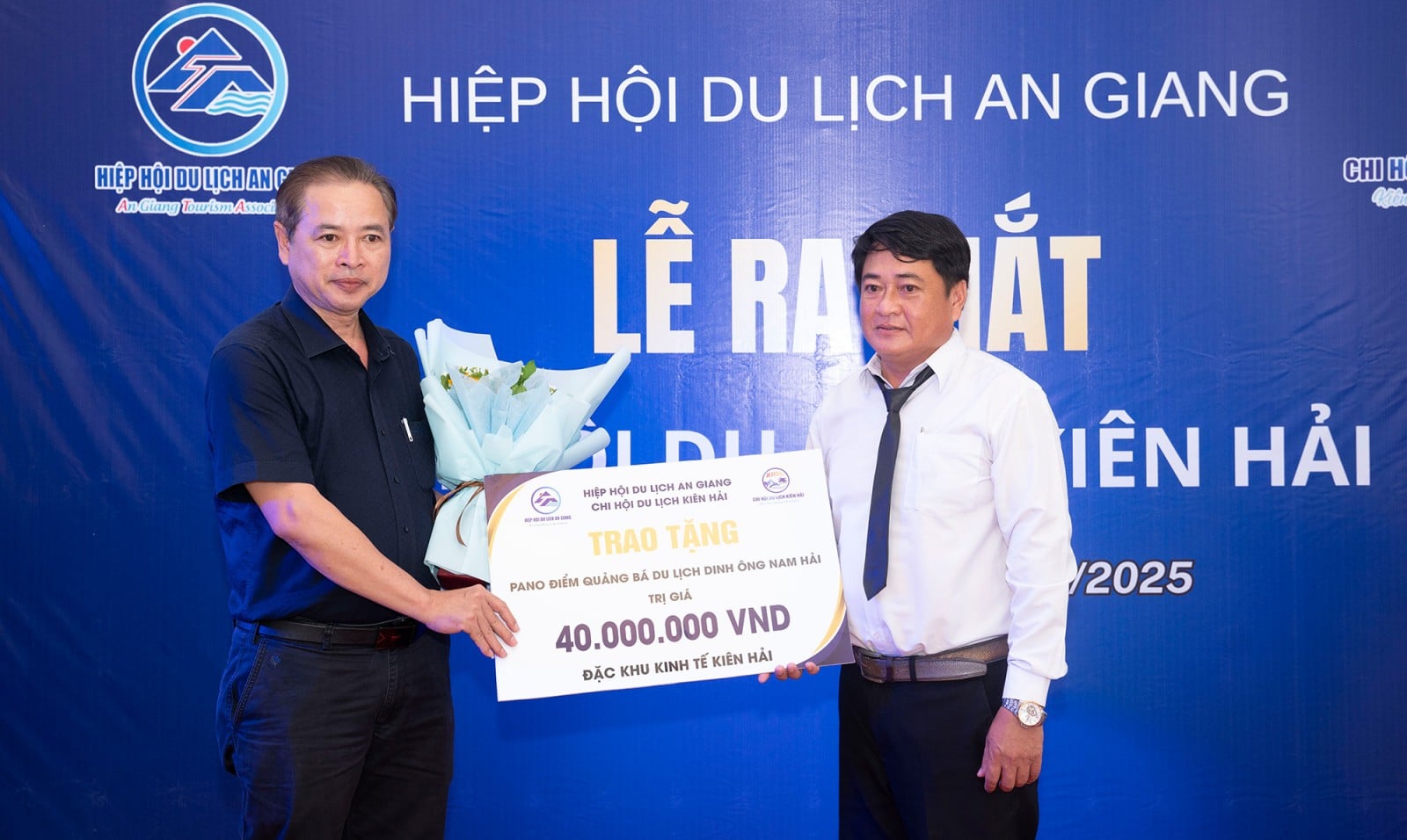 Persatuan Pelancongan Kien Hai menyumbangkan papan iklan simbolik yang mempromosikan pelancongan Dinh Ong Nam Hai bernilai 40 juta VND ke zon khas Kien Hai.
