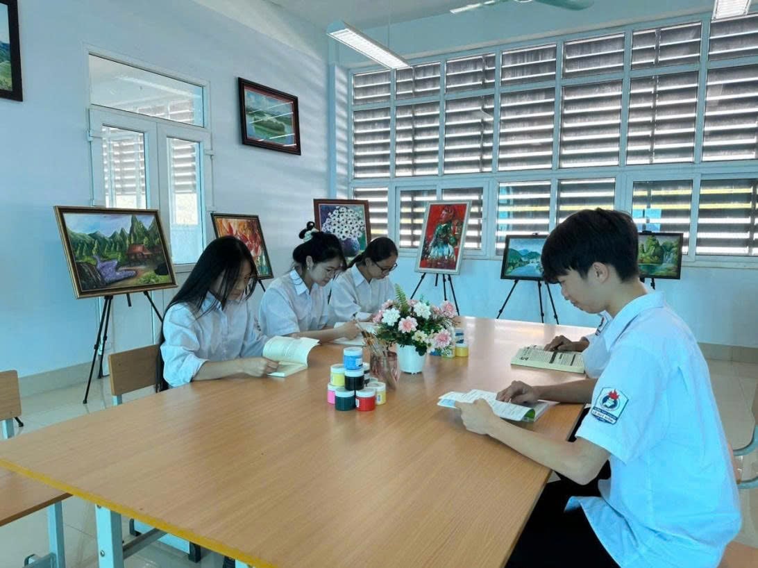Beberapa gambar pelajar Sekolah Tinggi Le Quy Don untuk dokumen penyelidikan Berbakat di Perpustakaan Sekolah: