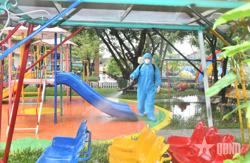 Kakitangan perubatan Pemerintah Kota Hue menyembur disinfektan di Tadika Thuy Duong, wad Thanh Thuy. |