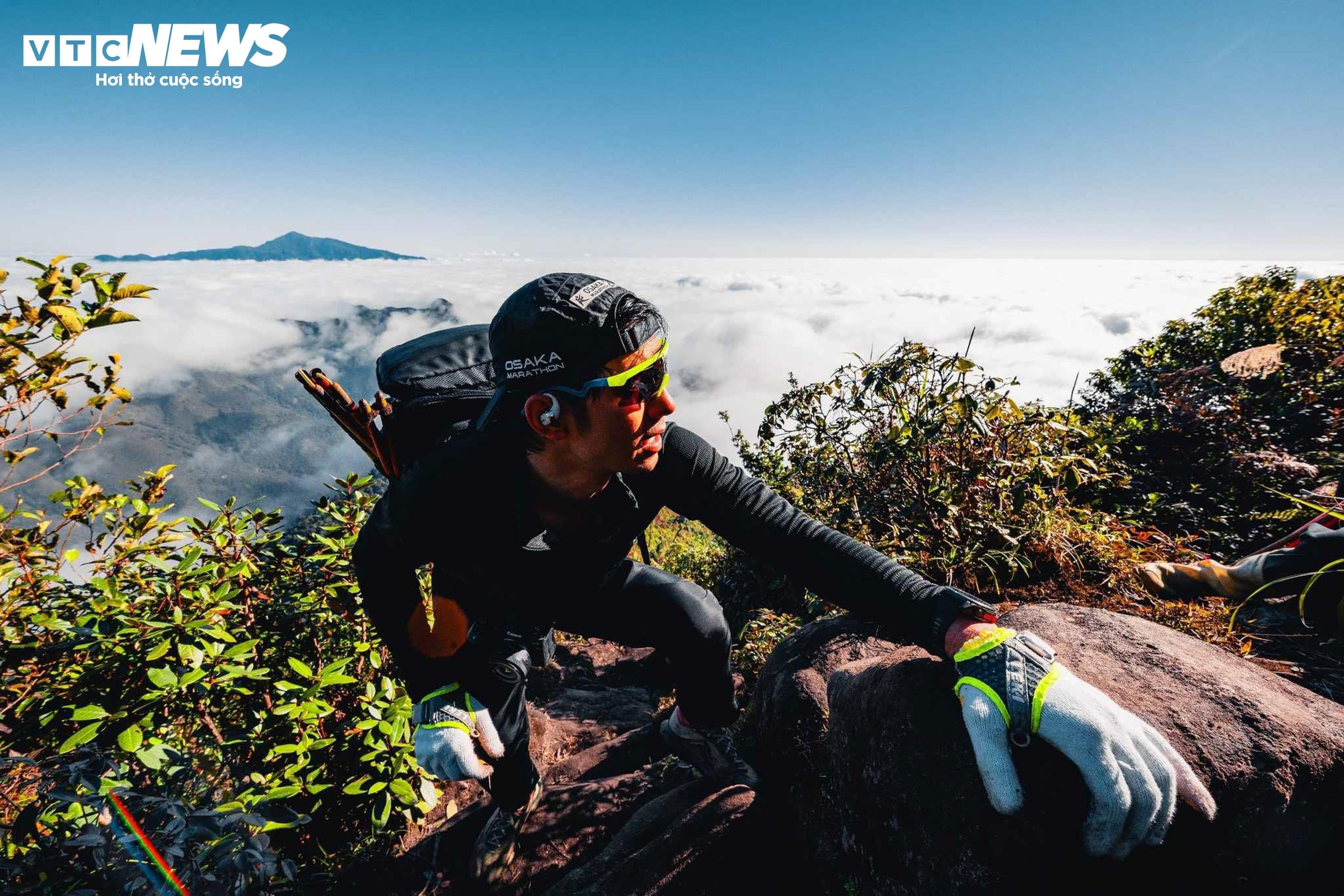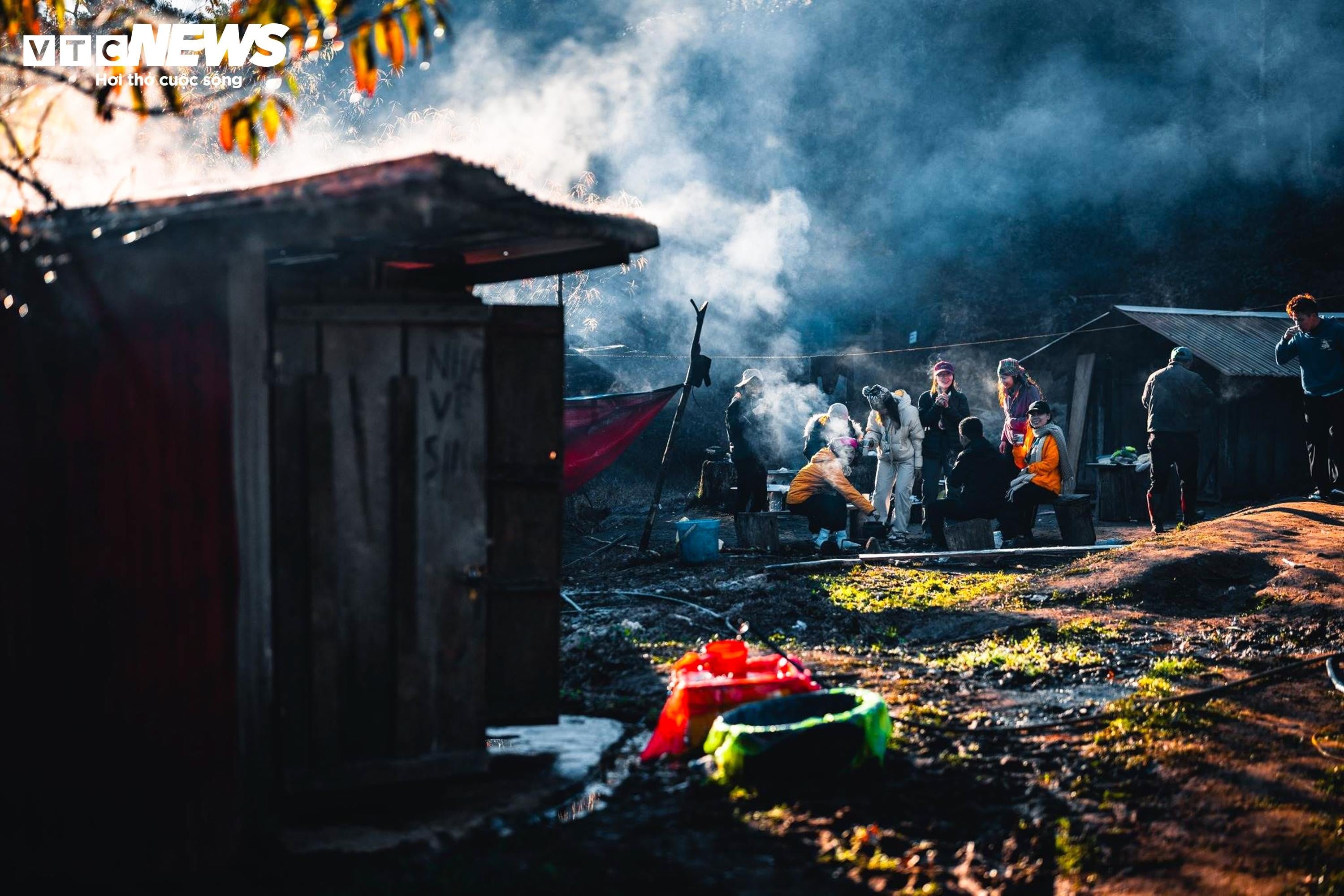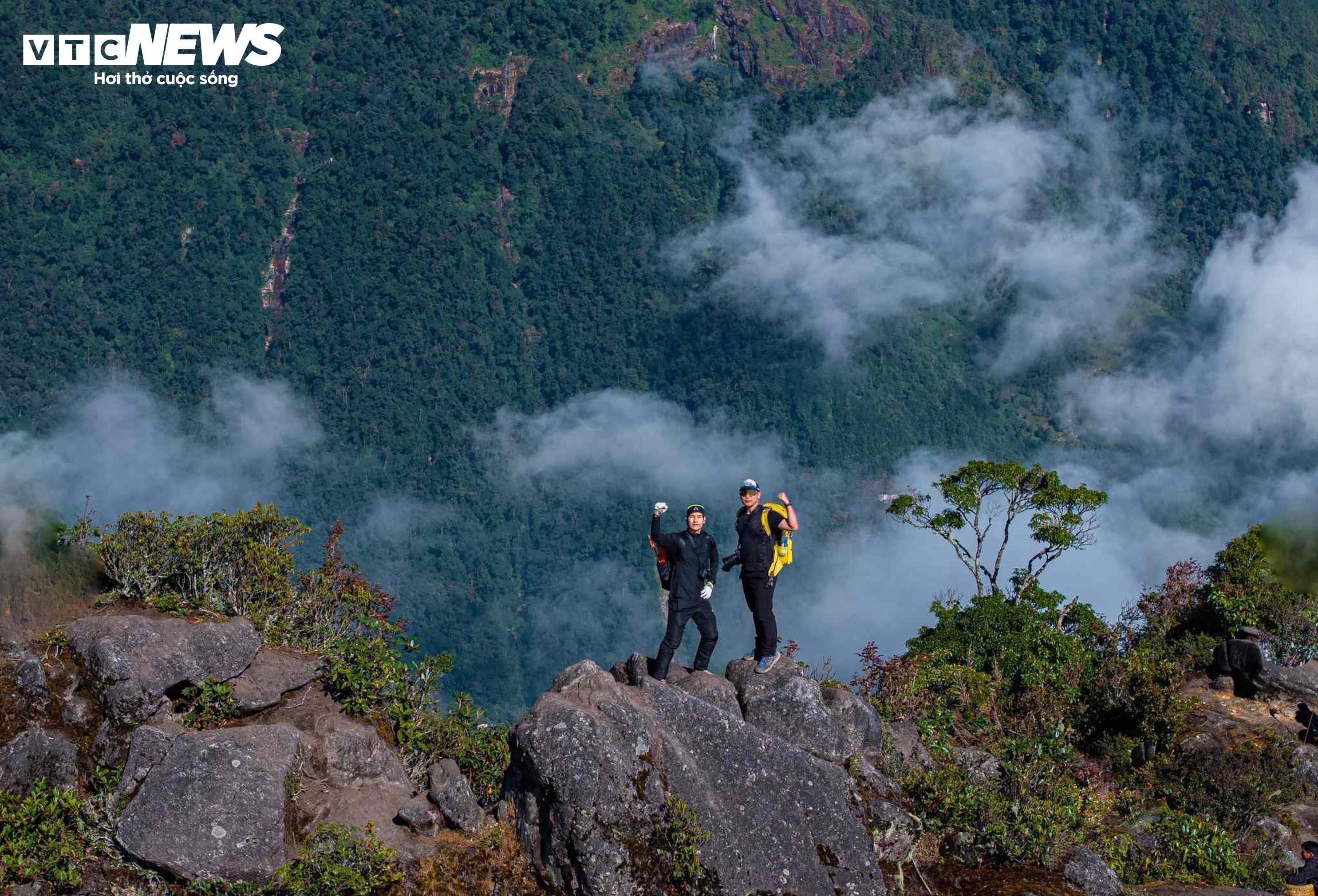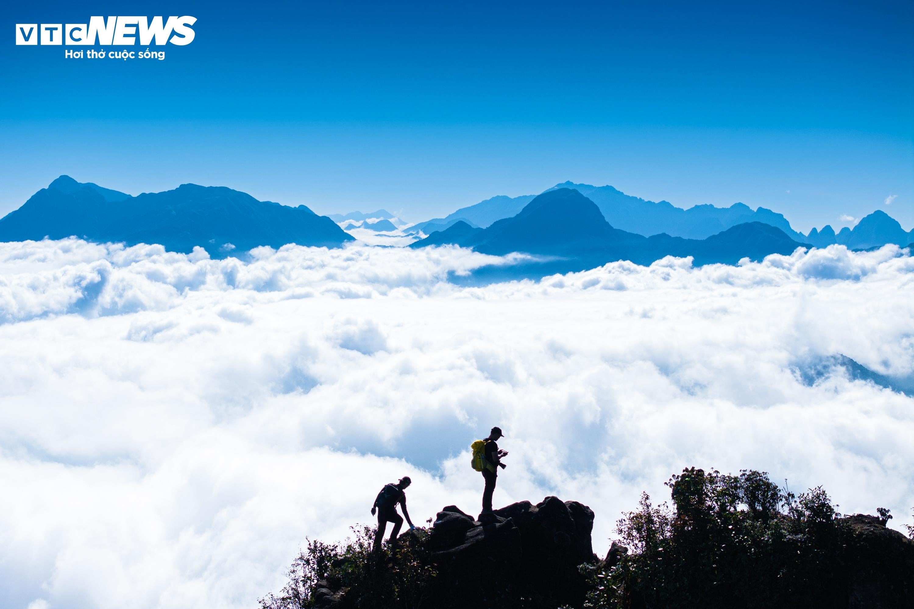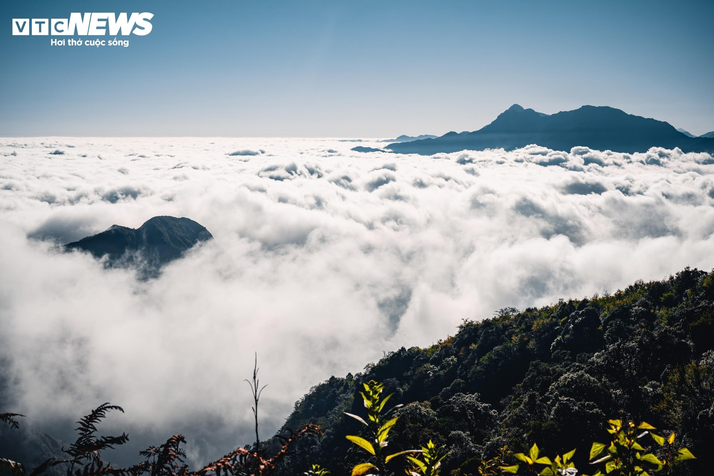 Tại khu vực gần đỉnh 3.046 m, biển mây dày đặc hiện ra, cuồn cuộn tràn qua các sống núi như sóng trắng. Ánh mặt trời đầu ngày nhuộm dần lớp mây thành màu vàng nhạt, tạo nên khung cảnh mờ ảo khiến nhiều người không giấu được sự ngỡ ngàng.