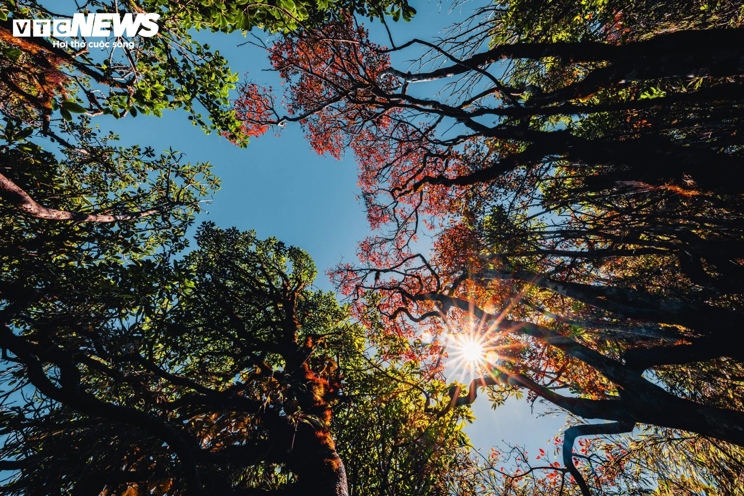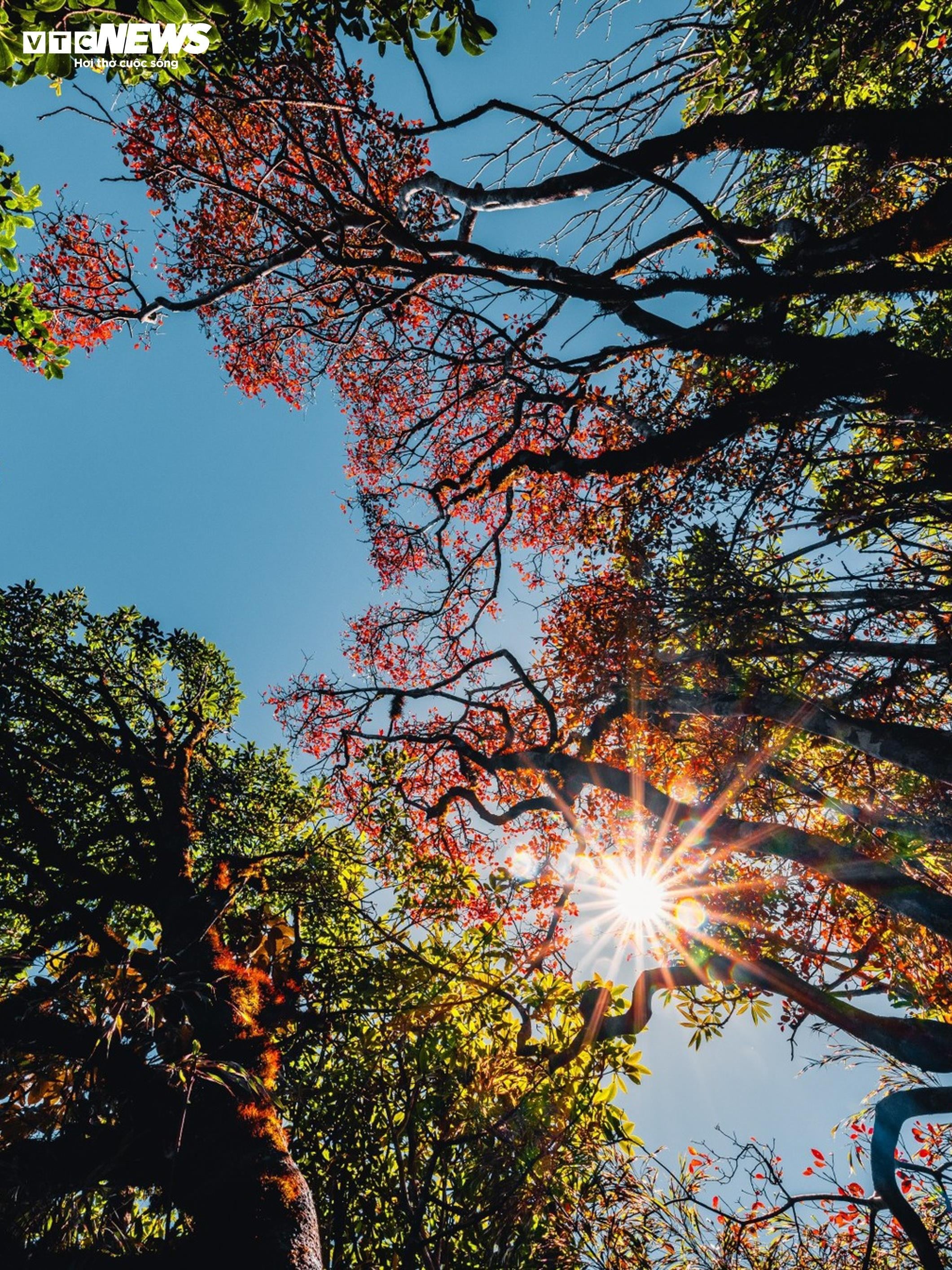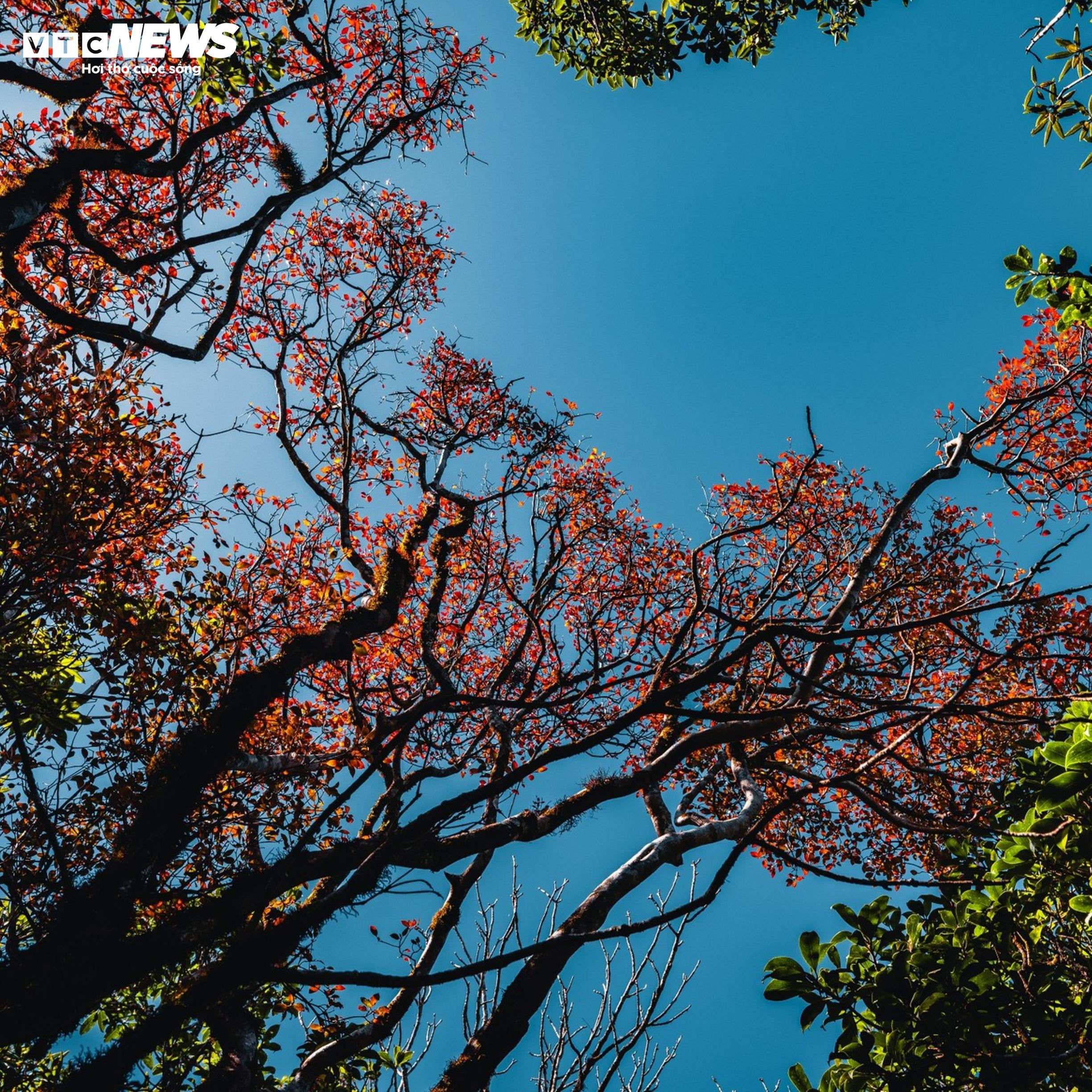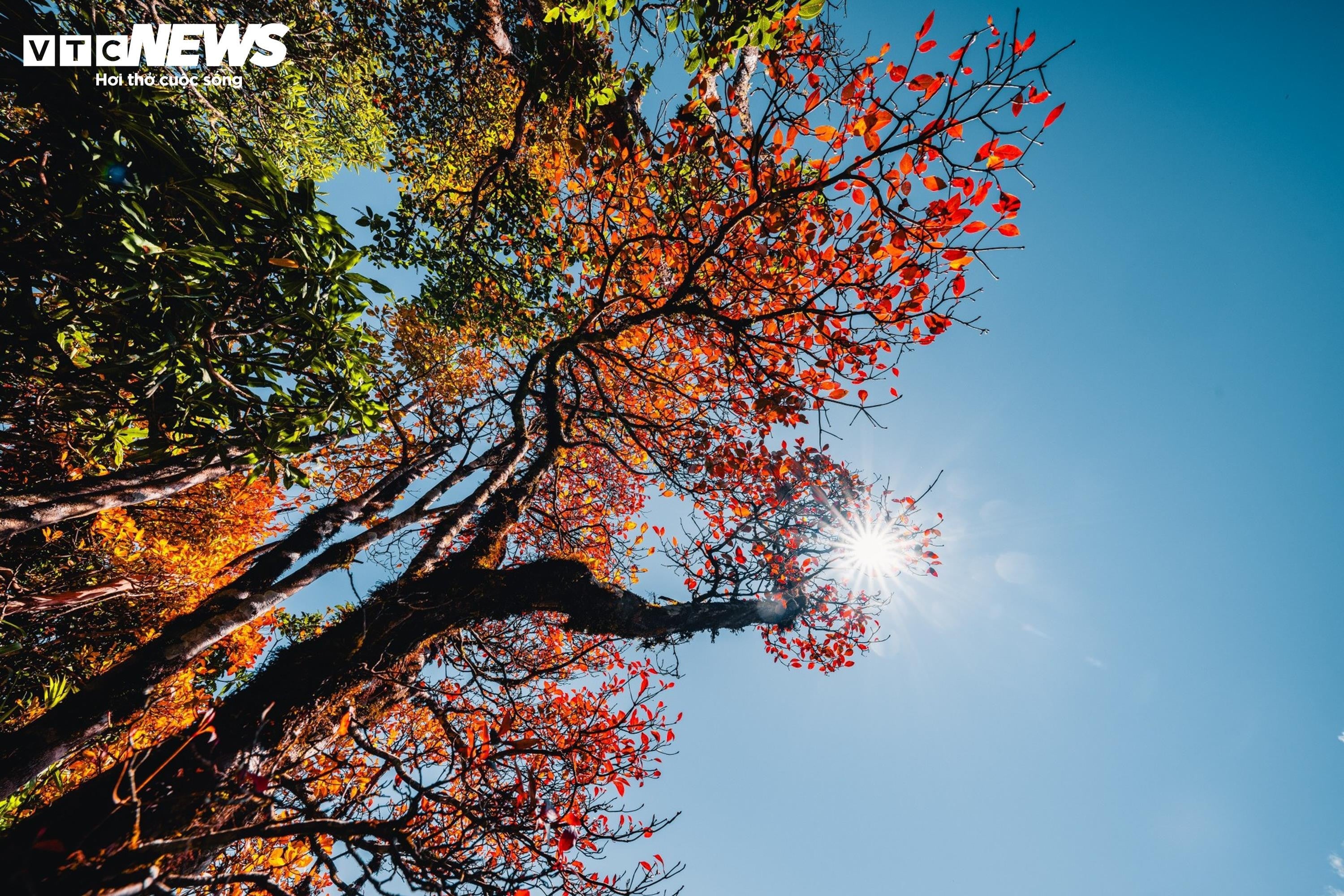 Từ độ cao hơn 2.000 m, du khách bắt đầu thấy rõ sự thay đổi của cảnh quan. Những thân phong cao vút vươn lên giữa rừng, lá chuyển màu từ vàng nhạt sang đỏ thẫm. Nhiều người tranh thủ chụp vài tấm hình khi nắng chiếu xuyên qua tán lá, tạo nên gam màu rực rỡ mà hiếm nơi nào trong vùng có được.