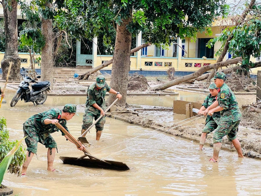 Lực lượng quân đội hỗ trợ dọn vệ sinh khuôn viên Bệnh viện Tâm thần Quy Nhơn (phường Quy Nhơn Bắc) do ảnh hưởng của lũ lụt. Ảnh: Minh Nhật
