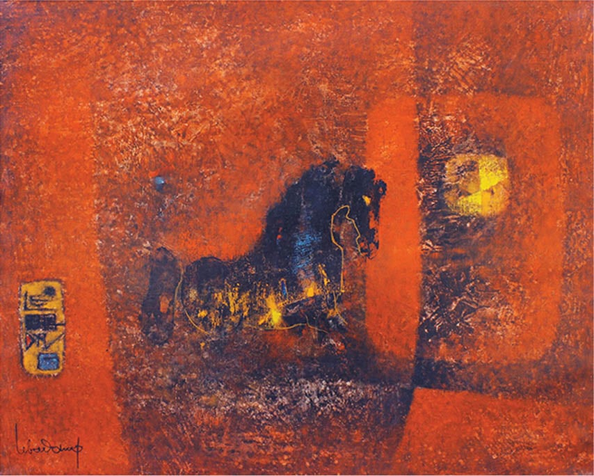 | “Ngựa và hoàng hôn”, sơn dầu nổi bật với nền đỏ và mảng sáng vàng lam, tạo bố cục mở làm bật dáng ngựa giữa ánh chiều |