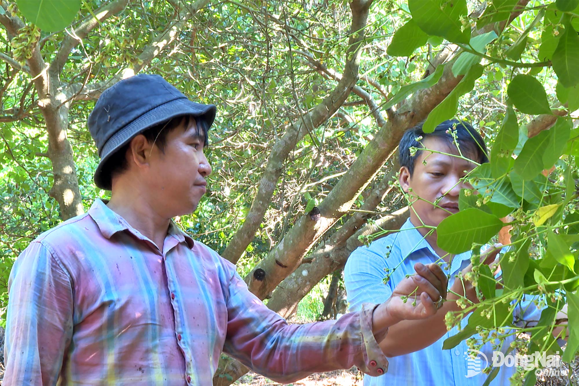 | Anh Đàm Văn Doòng (bên trái) chia sẻ, trao đổi về cách chăm sóc vườn điều với cán bộ xã Tân Lợi. Ảnh: Minh Hiền |