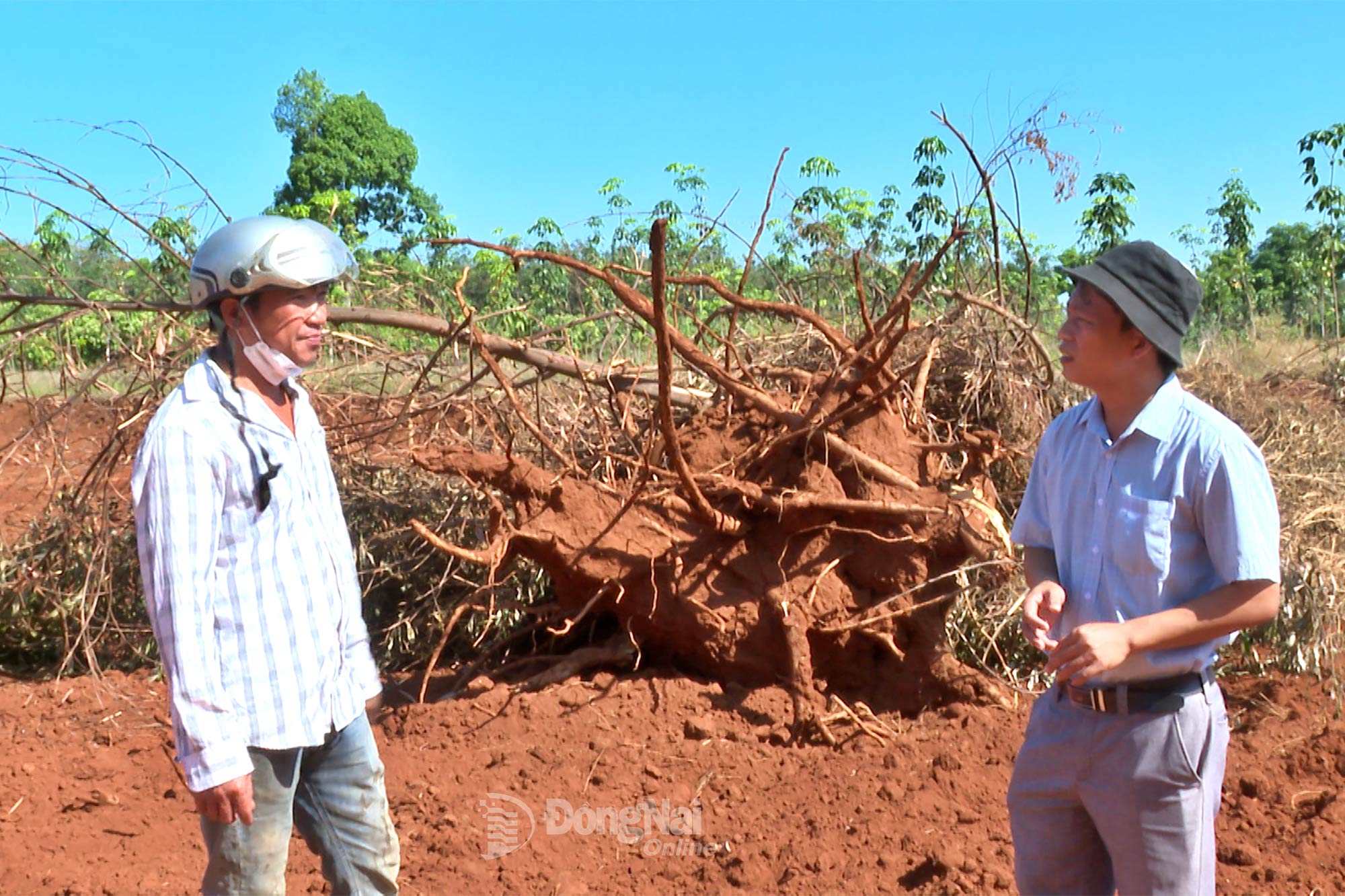 | Anh Đàm Văn Doòng (bên phải) đã hiến gần 8 sào đất và hơn 1.000 gốc tiêu đang thu hoạch để làm tuyến đường số 4, xã Tân Lợi. Ảnh: Minh Hiền |