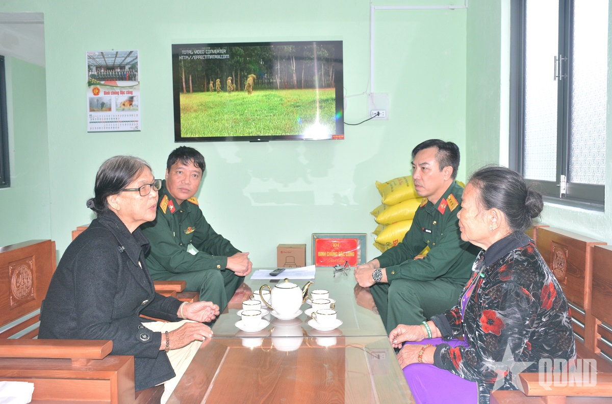 Cán bộ cơ quan Binh chủng Đặc công, Lữ đoàn Đặc công bộ 198 thăm hỏi, động viên bà Nguyễn Thị Tám, 76 tuổi, thôn Phú Phong, xã Hòa Thịnh, tỉnh Đắk Lắk (bên trái) trong ngôi nhà mới.