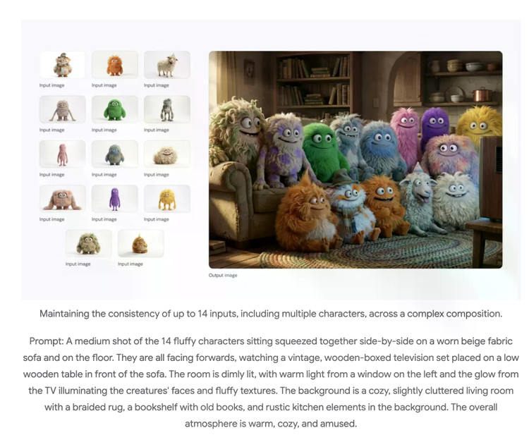 Nano Banana Pro verbetert ook de consistentie van het ontwerp. Volgens Google kunnen gebruikers tot 14 verschillende afbeeldingen aanleveren en het model deze naar wens laten rangschikken, met behoud van de kenmerken van maximaal vijf afbeeldingen. De tool behoudt de look en feel van vrienden, familie en huisdieren, ongeacht hun kapsels of outfits.
