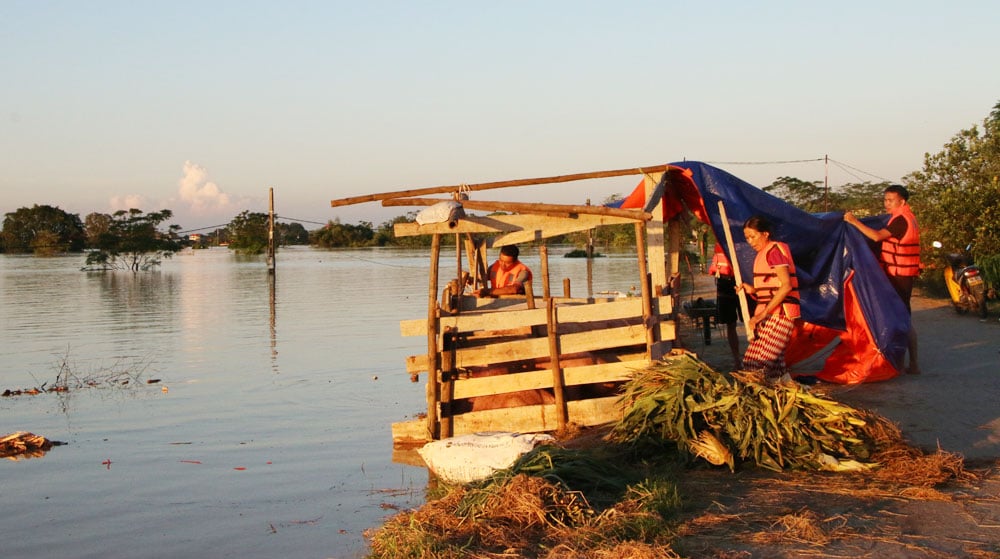 De overstromingen in de rivier de Cau nemen toe, waardoor de lokale bevolking gedwongen wordt hun huizen te verlaten. |