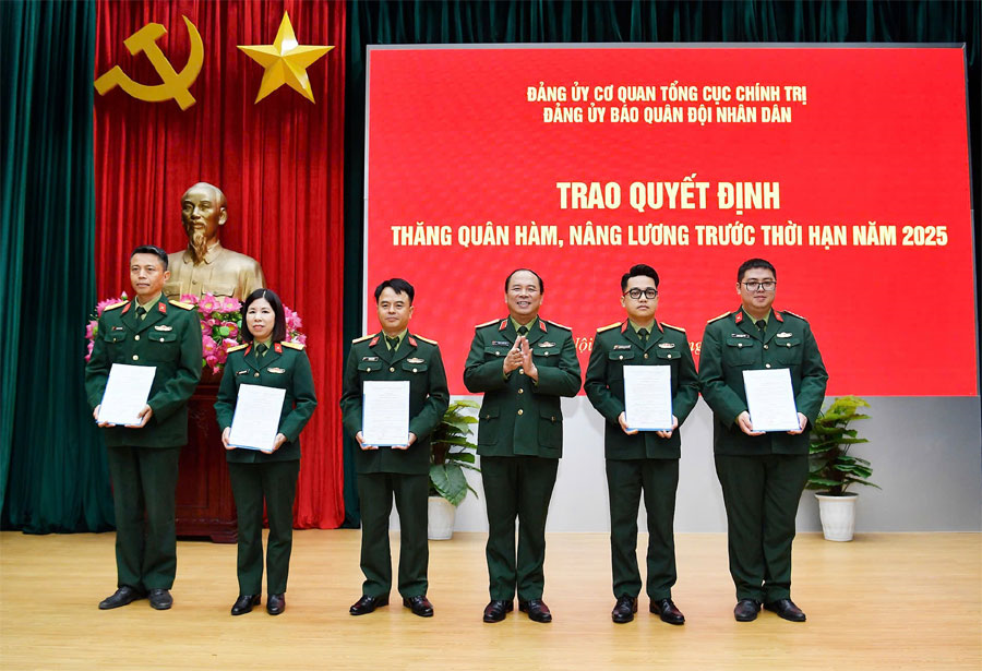 | Generaal-majoor Doan Xuan Bo presenteerde het besluit om militaire rangen te bevorderen en salarissen vervroegd te verhogen in 2025 aan officieren en verslaggevers. |