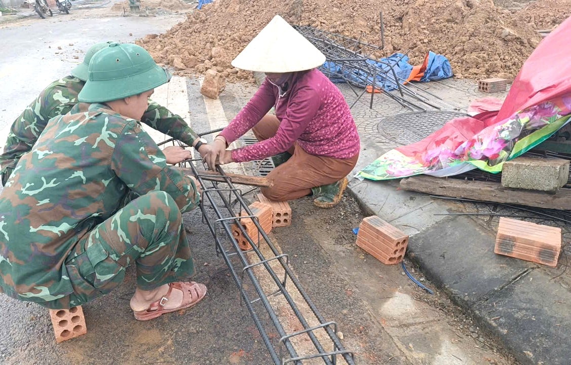 | Militaire troepen steunen de bewoners van de gemeente Khe Tre bij de bouw van nieuwe huizen. Foto: TRUNG DOAN |