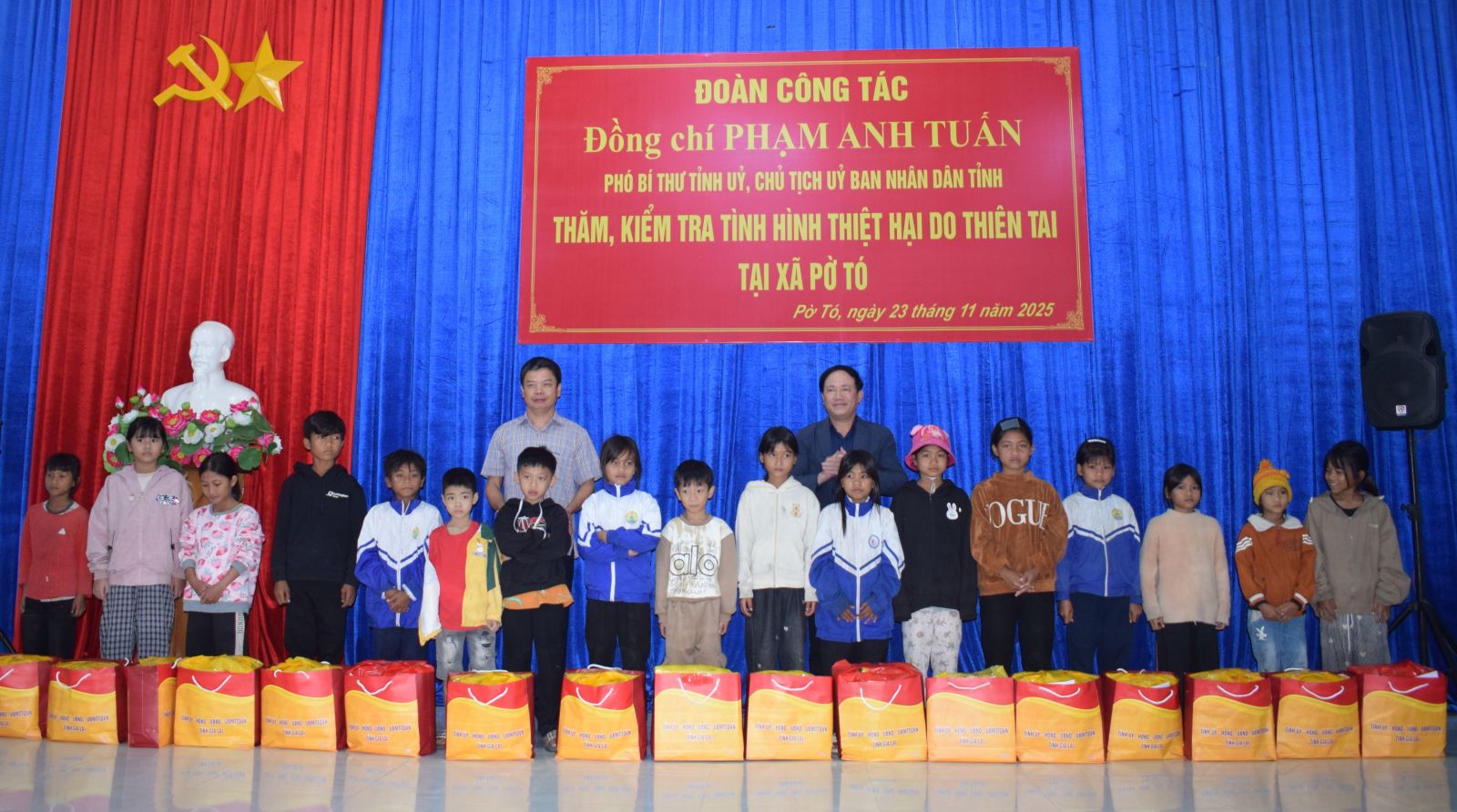 Dienovereenkomstig bracht de delegatie van de voorzitter van het Provinciaal Volkscomité, Pham Anh Tuan, een bezoek aan en overhandigde geschenken aan huishoudens die getroffen waren door stormen en overstromingen; arme huishoudens, bijna-arme huishoudens; en studenten met moeilijke omstandigheden in de gemeenten Po To, Ia Pa, Ia Hiao, Ia Tul, Ua, Ia Rsai en Ia Dreh (10 geschenken per gemeente). Tegelijkertijd werden geschenken aangeboden om de geestdrift van lokale partijcomités en -autoriteiten te versterken.