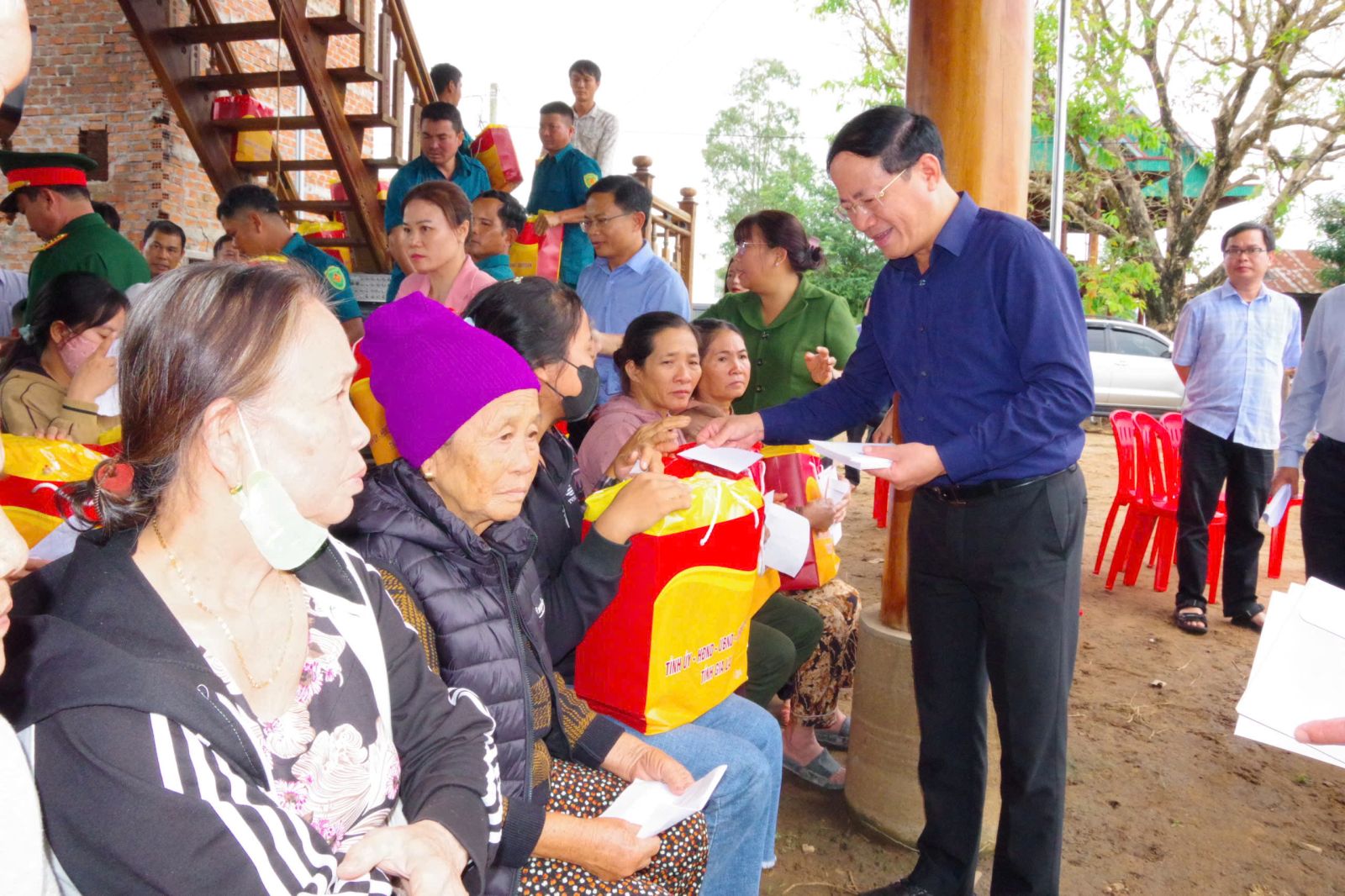 Voorzitter Pham Anh Tuan geeft geschenken aan de inwoners van de gemeente Ia Dreh