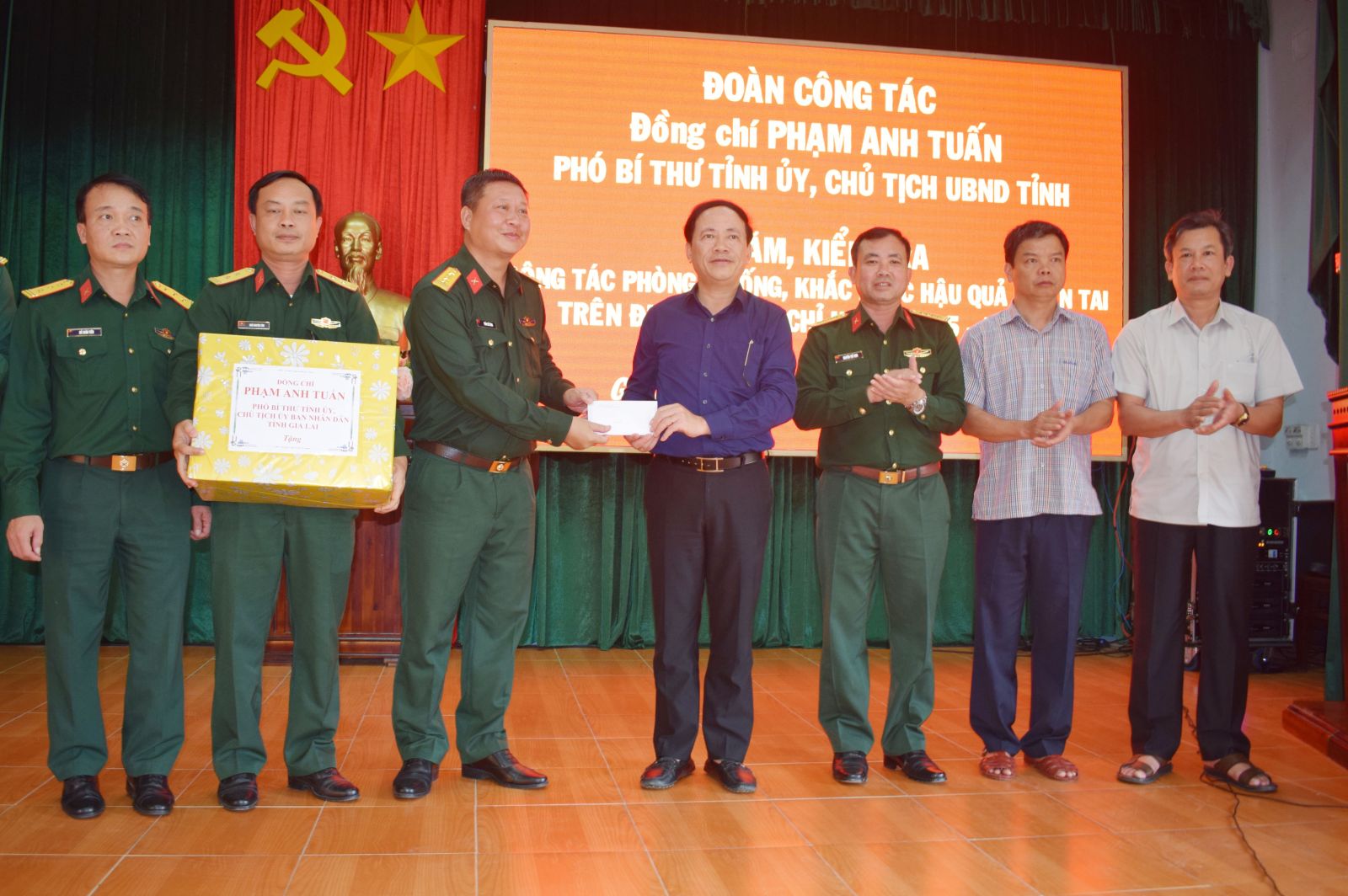 Bij deze gelegenheid bracht de delegatie van de voorzitter van het Provinciaal Volkscomité, Pham Anh Tuan, ook een bezoek aan het Defensiecommando van Regio 5 - Ayun Pa, waar hij geschenken overhandigde. De voorzitter van het Provinciaal Volkscomité erkende, prees en waardeerde het werk van de organisatie, redding en ondersteuning van mensen tijdens de recente storm en overstroming. Hij verzocht de officieren en soldaten van de eenheid om synchroon oplossingen te blijven inzetten om mensen en lokale autoriteiten te ondersteunen bij het overwinnen van de gevolgen van de overstroming. In de nabije toekomst is het noodzakelijk om dringend scholen op te ruimen en voldoende tafels en stoelen te regelen om leerlingen morgen weer op school te kunnen verwelkomen. Tegelijkertijd moet er nauw worden samengewerkt met de politie om absolute veiligheid en orde te garanderen en moet er worden deelgenomen aan de tijdige distributie van voedsel en levensmiddelen, ondersteund door de Centrale en de provincie.
