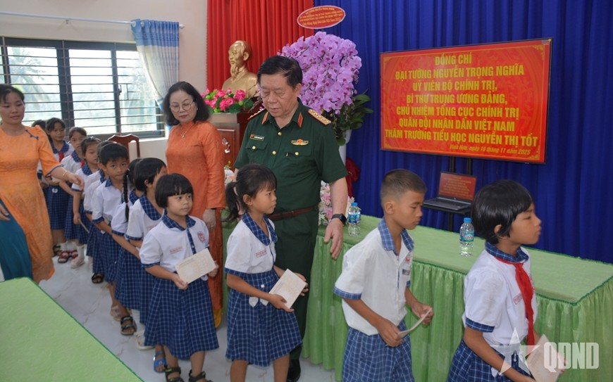 Nadat hij de schoolfaciliteiten had bezocht, gaf generaal Nguyen Trong Nghia uiting aan zijn blijdschap en enthousiasme over de moderne, veilige en vriendelijke leeromgeving waarin het personeel, de leraren en de leerlingen van de Nguyen Thi Tot basisschool terechtkunnen.